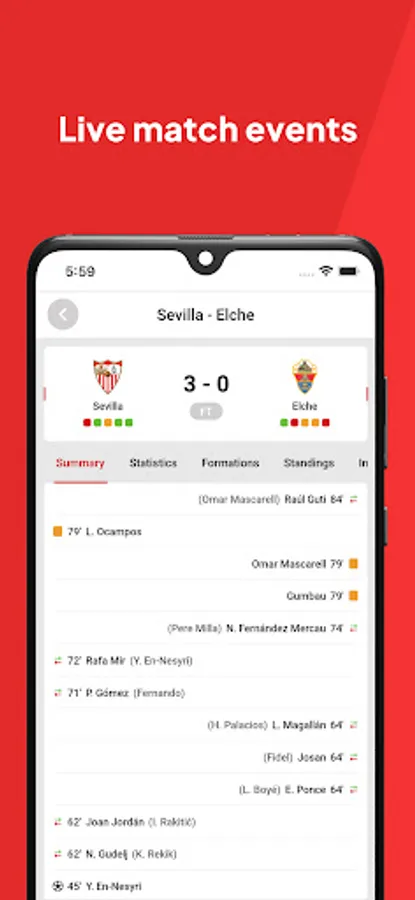 See statistics and information from games like scorers Erik Manuel Lamela Cordero, Óliver Torres Muñoz, Youssef En-Nesyri, Rafael Mir Vicente.