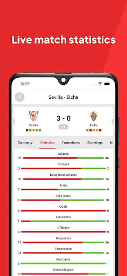 You can view detailed information about Sevilla match. You can view the last matches played by the two teams, along with the Sevilla match roster, match statistics, formation, in-match actions.