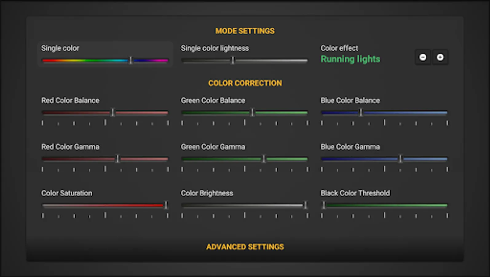 SINGLE COLOR MODE – his mode allows you to include all the backlighting with one color selected in the program settings. This mode suits well as a night room lighting, surprisingly changing the familiar interior.