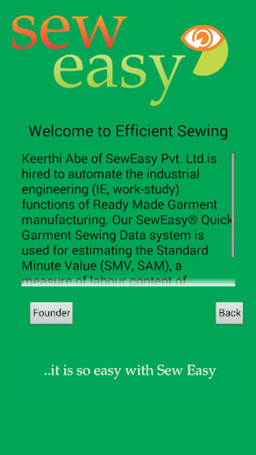 Keerthi Abe of SewEasy Pvt. Ltd.is hired to "automate" the industrial engineering (IE, work-study) functions of Ready Made Garment manufacturing. Our SewEasy® Quick Garment Sewing Data system is used for estimating the Standard Minute Value (SMV, SAM), a measure of labour content of garments, home furnishing, lingerie, leather goods and all sewn products.