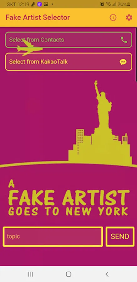 The game master selects players to play with from the Contacts and KakaoTalk friends, and enters a topic. Then a fake artist is randomly selected among the selected players. When you push 'Send' button, the topic and the identity are automatically delivered to each player via SMS or KakaoTalk message.