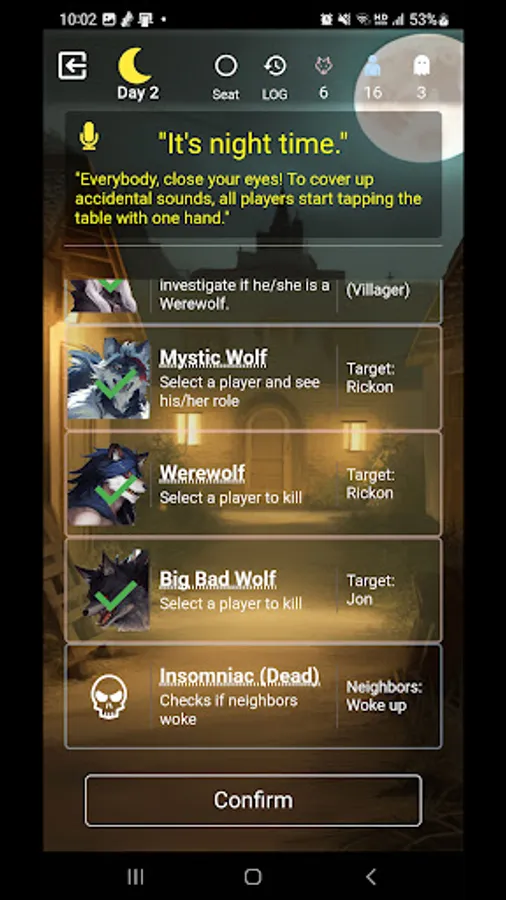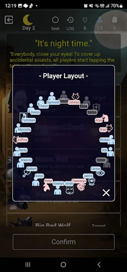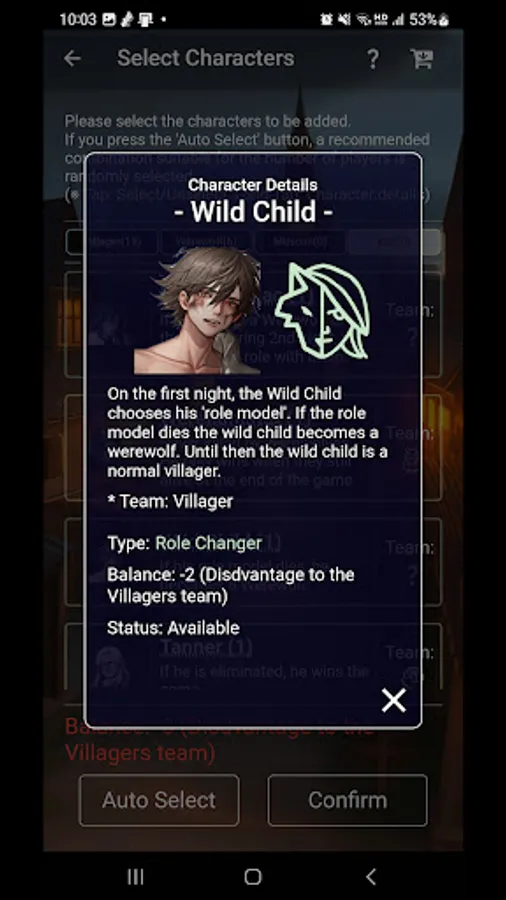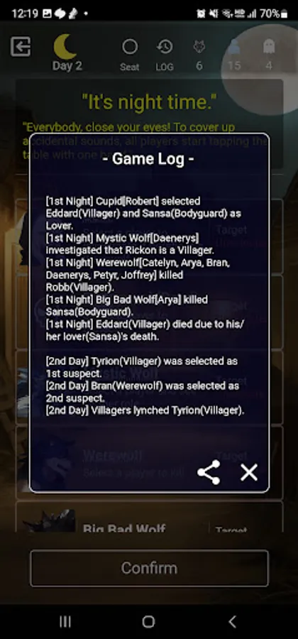 Werewolf games represented by 'Tabula's Wolf' are very fun, but they require a moderator. The moderator role in a Werewolf game requires a lot of experience, and as the number of players and characters increase, it becomes increasingly difficult and more likely to make mistakes. This app helps people who are not very experienced in Werewolf games easily become moderators. Even if you are inexperienced, it is designed so that you can proceed without much difficulty just by following the instructions in the app. It supports various characters and automatically avoids many possible mistakes. It also provides automatic save and resume functions and various convenience functions.