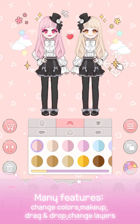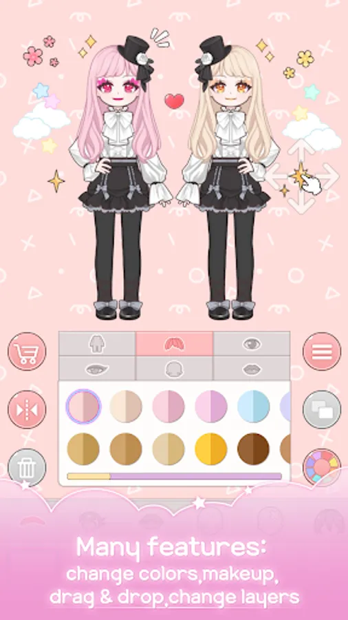 4. There are many available features such as changing the color, makeup, changing layers, drag & drop, pretty animations, and ample storage space.