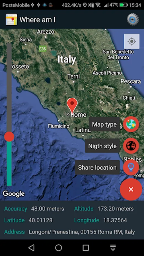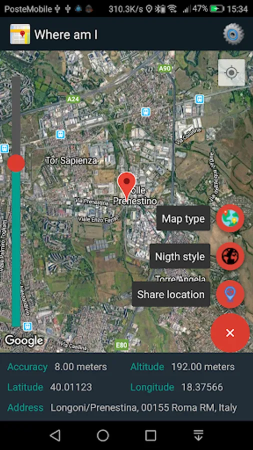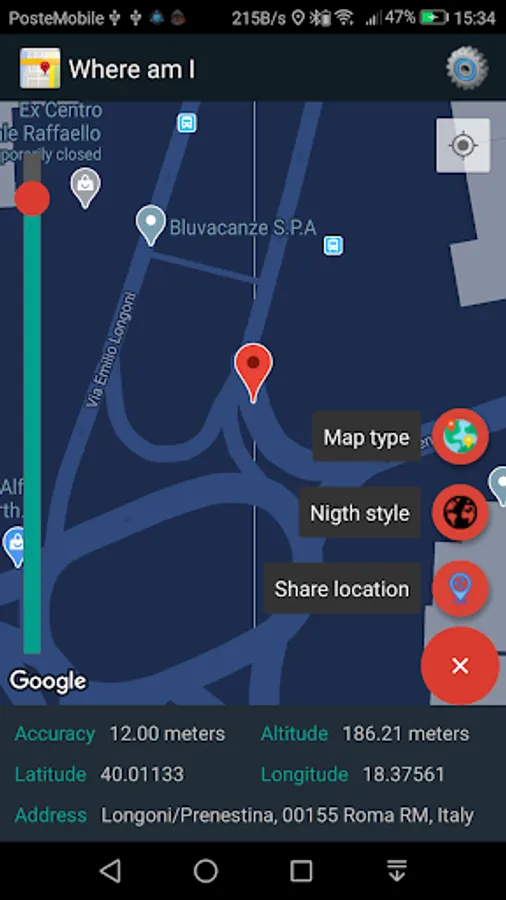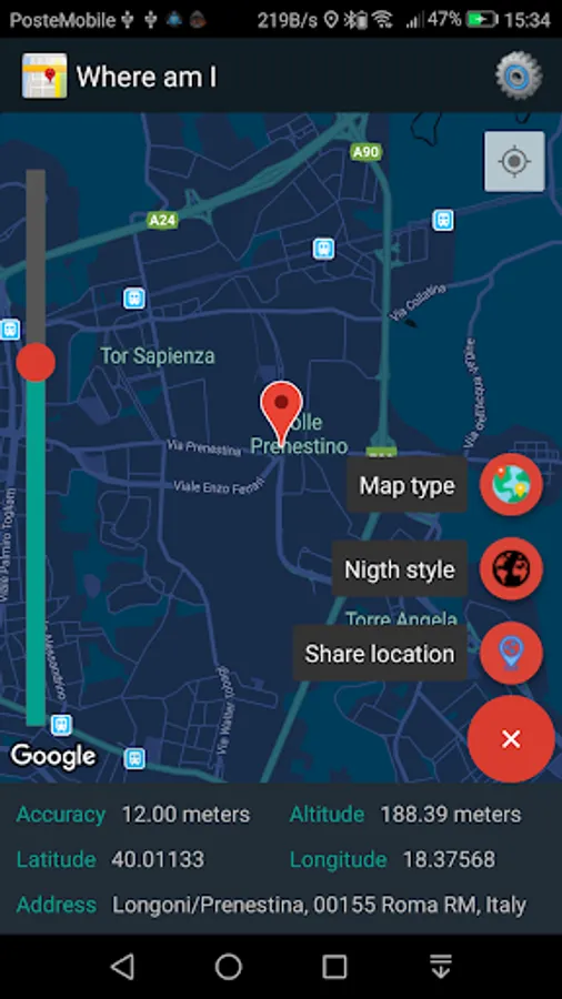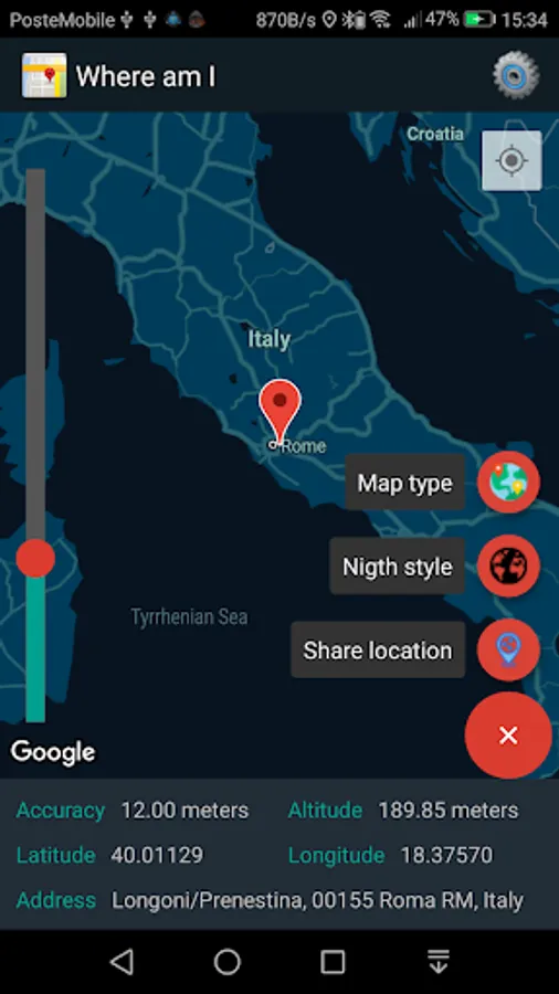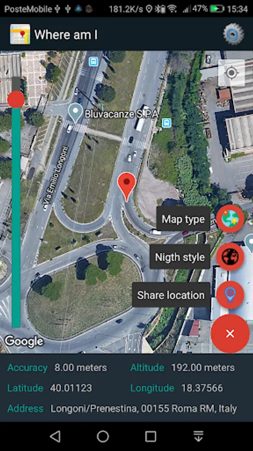From anywhere within the application, you can easily share the current location data through your favorite messaging application. Your friends will receive GPS coordinates and a link on Google Maps indicating your location. In addition, you can copy the GPS coordinates to the clipboard and paste them on map, chat or e-mail applications and drag it to the new location.