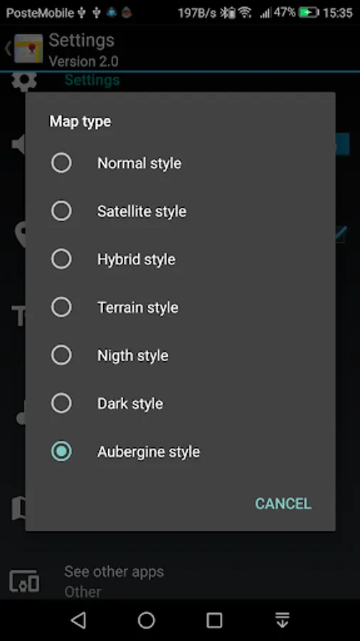 All the most common map types are supported, such as the map with driving directions, satellite map, hybrid map, earth view map, night map, dark map and aubergine map.