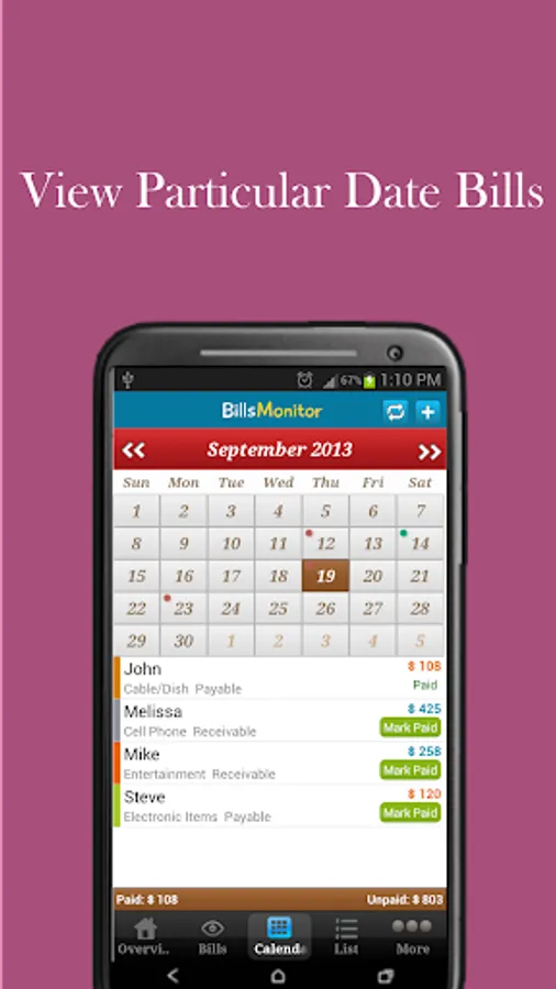 - Reminder about bills : Same day, one day before, two days before and a week before