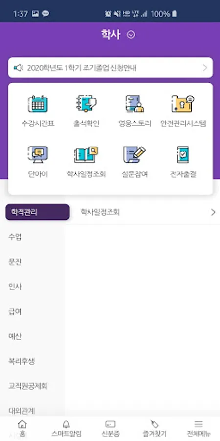 This app provides services such as mobile identification, push notification service, portal, web information system, employment, e-learning, library, and residence hall.