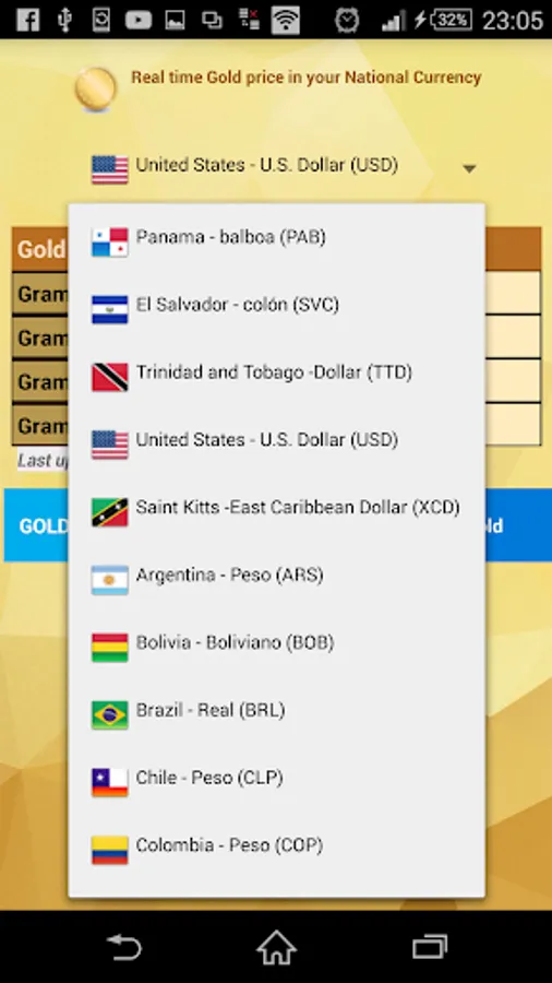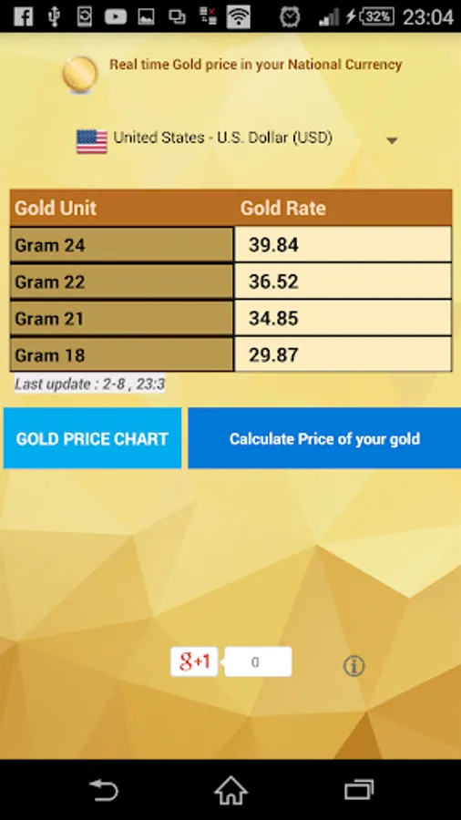 Gold Price is a free Android app that offer Real time gold price in your National Currency in different karats. Also show the price of your gold in grams or ounces.