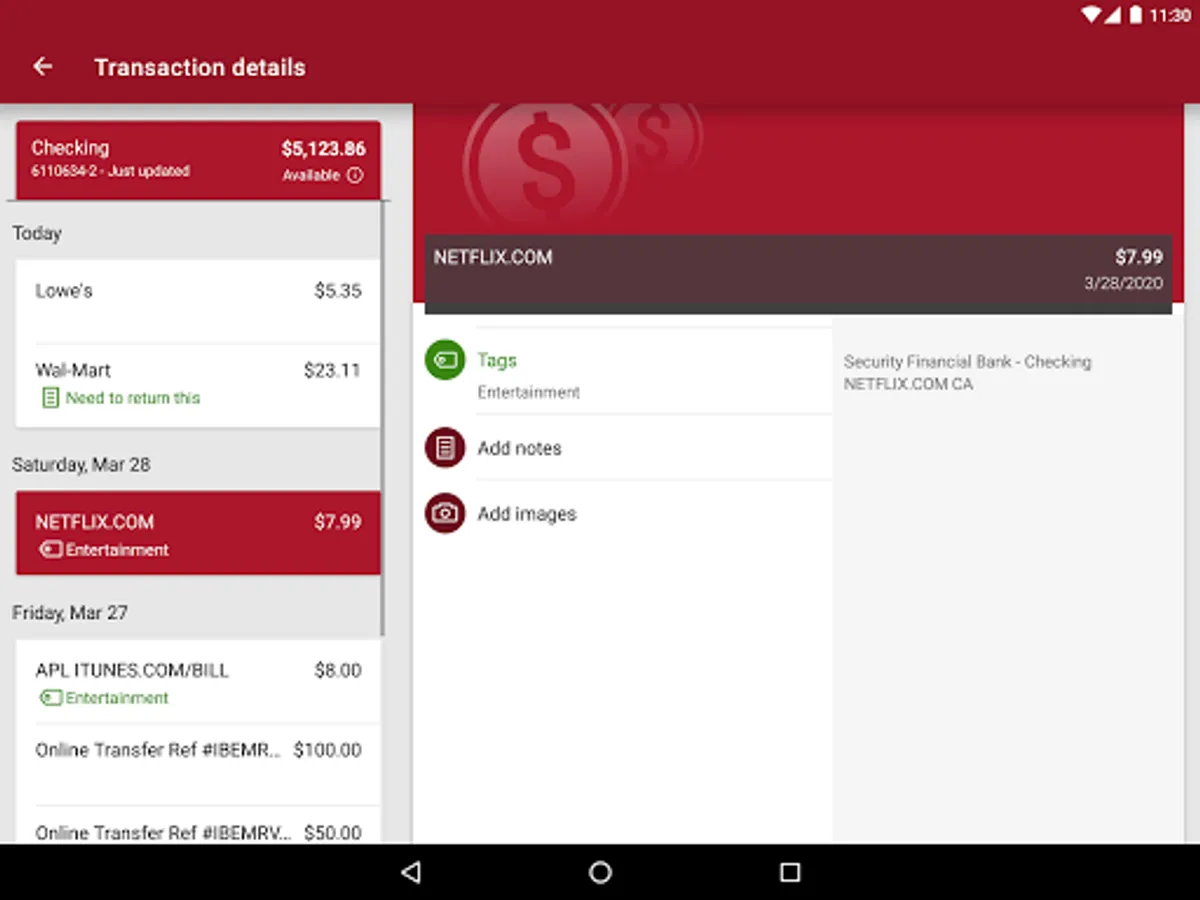 Add Tags, Notes, Images & Geo-Information: By enhancing transactions with custom tags, notes or photos of a receipt or check, you have the ability to stay organized and find exactly what you’re looking for when searching through your finances.