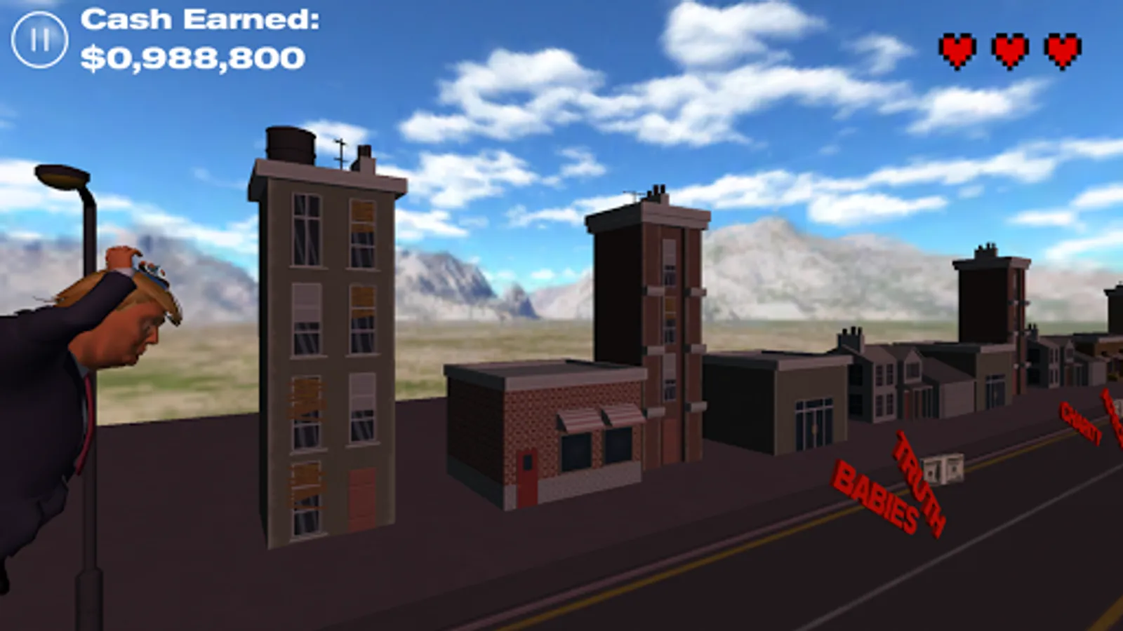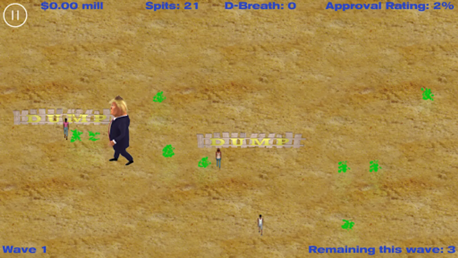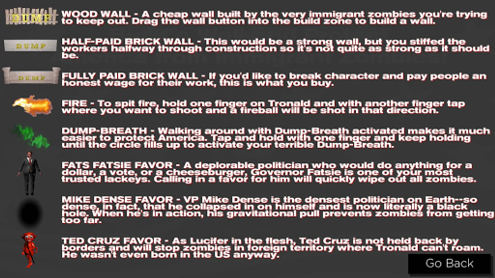 In this game you play Tronald Dump, a small-handed politician who is determined to prevent immigrants from entering his country and defiling the American dream. As Tronald, you must patrol the border and build a wall to keep out illegal aliens. Every zombie immigrant that makes it into America hurts your approval rating. Raise money for your wall by avoiding obstacles such as "Taxes" and "Facts". After each wave of zombie immigrants you can rebuild your wall, buy weapons, and pay for political favors from VP Mike Dense, Fats Fatsie, and Lucifer in The Flesh (a.k.a. Ted Cruz). If you let too many zombie immigrants into your country, you will be impeached!