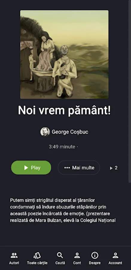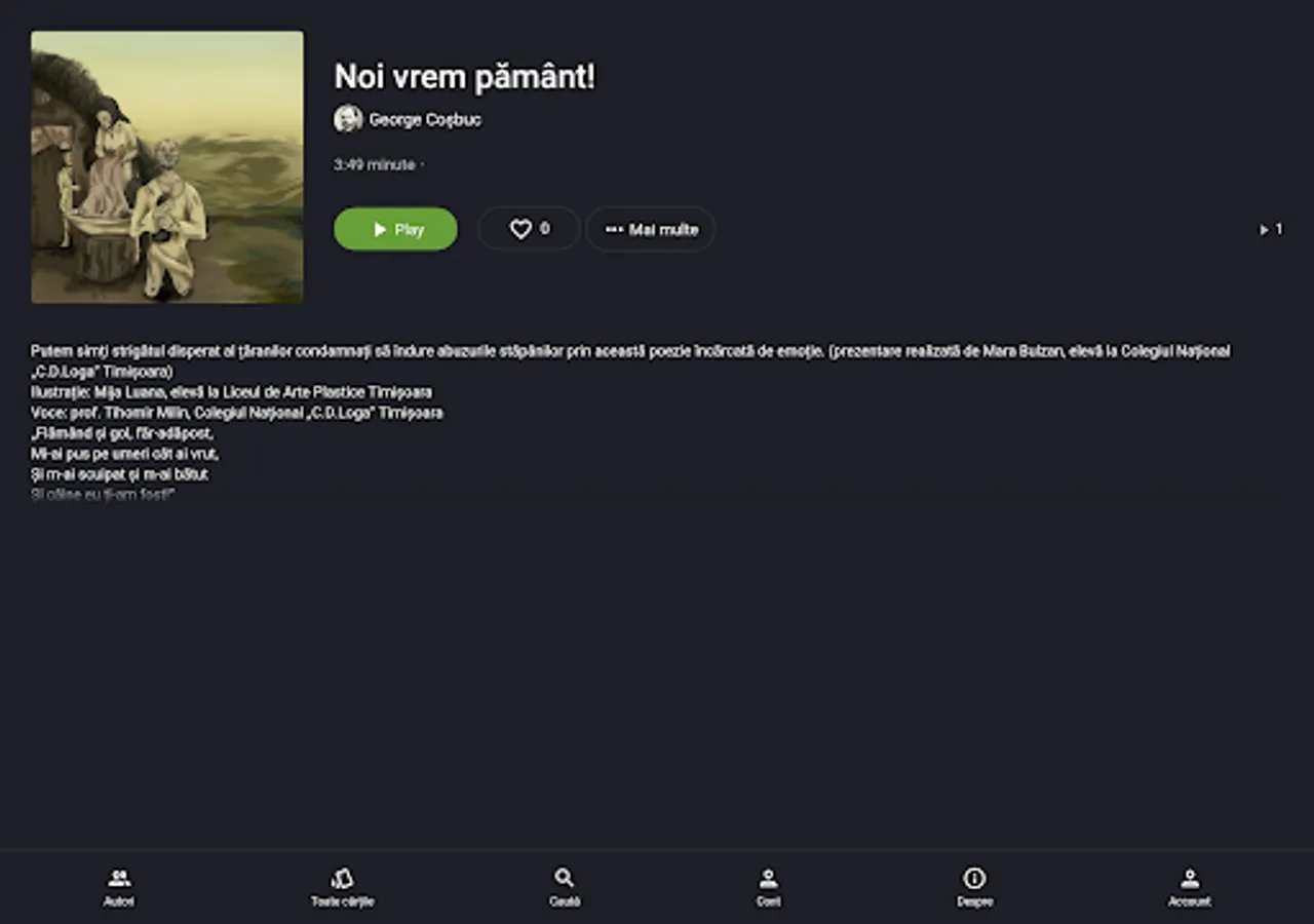 eLibrăria is a digital library of audio books in Romanian literature, created by the Sfera Timișoara Association - an organization that supports the community through education, environment and social intervention projects, together with reliable partners from the institutional and private environment. The audio books published in the eLibrary application are part of the program for the Baccalaureate in Romanian Language and Literature.