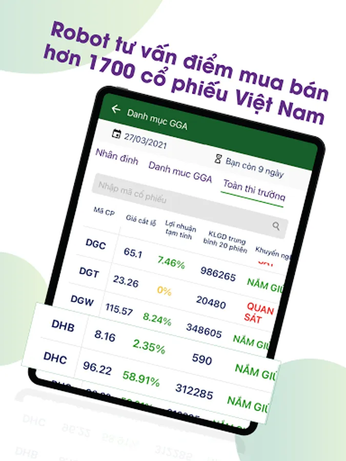 SFG APP provides consulting tools for buying and selling all stocks listed on Vietnam stock market. Especially, SFG app has a constantly updated strategic stock portfolio, daily investment advice and in-depth analysis reports for strong stocks in the market for investors' reference.