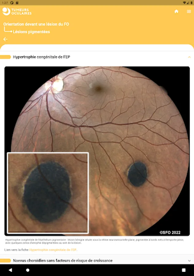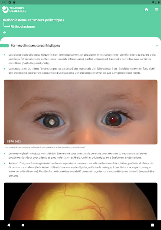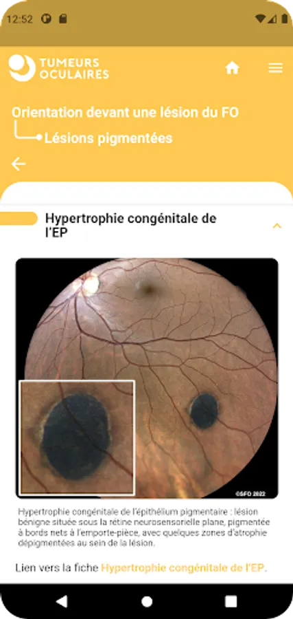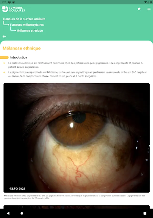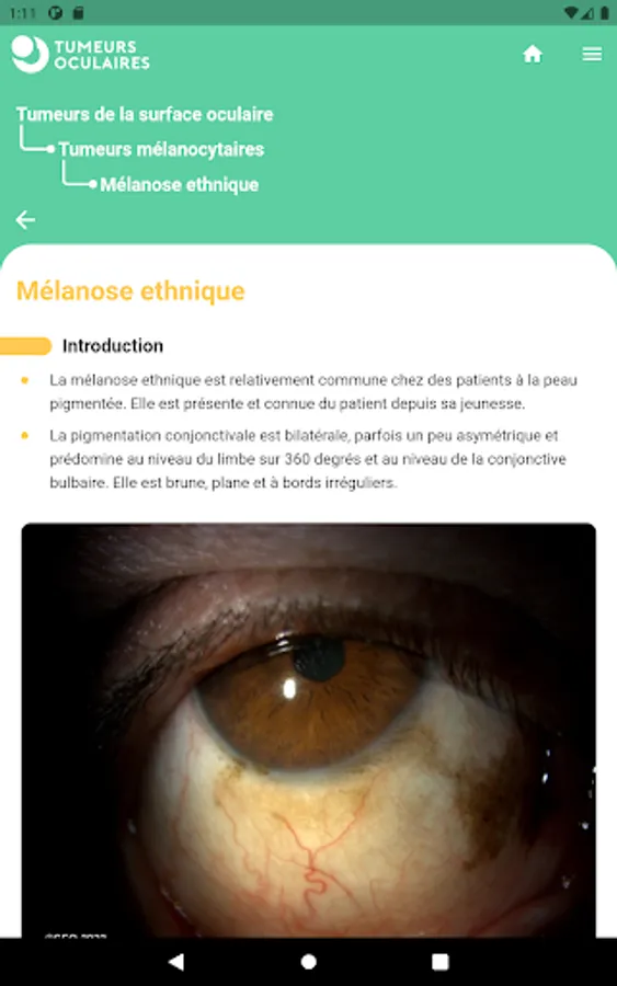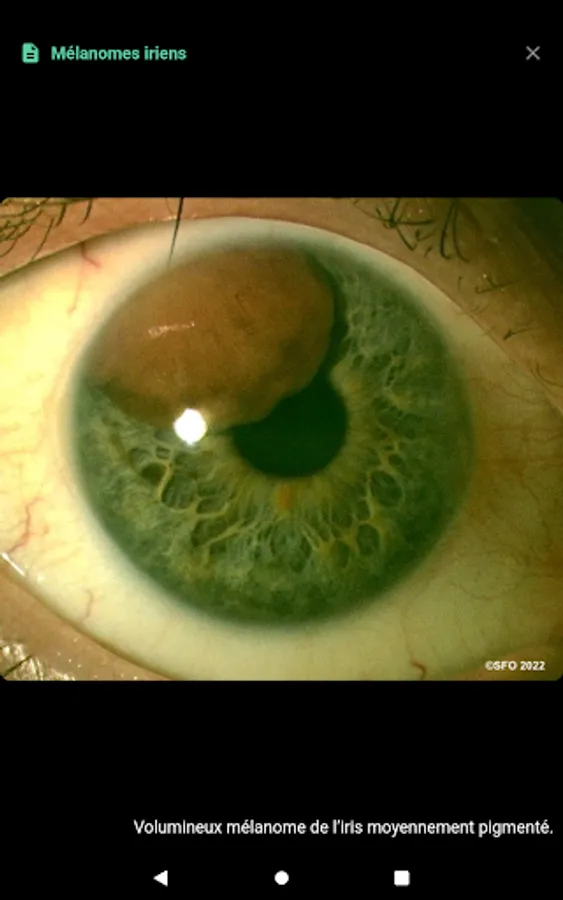 Produced by the authors of the 2022 report of the French Society of Ophthalmology (SFO) on ocular tumors, this application is made available free of charge to members of the SFO.