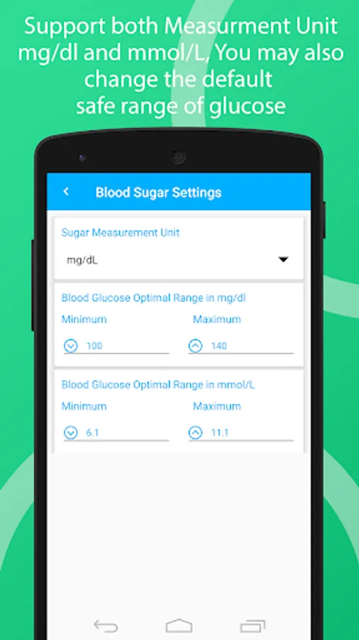 Diabetes have two types of measurements first is mg/dl (milligrams per deciliter) and the second one is mmol/L (Millimoles Per Litre), This app supports both types of measurements. The preferred measurement unit varies by country: mg/dl are preferred in the US, France, Japan, Israel, and India. mmol/l is used in Canada, Australia and China. Germany is the only country where medical professionals routinely operate in both units of measure.