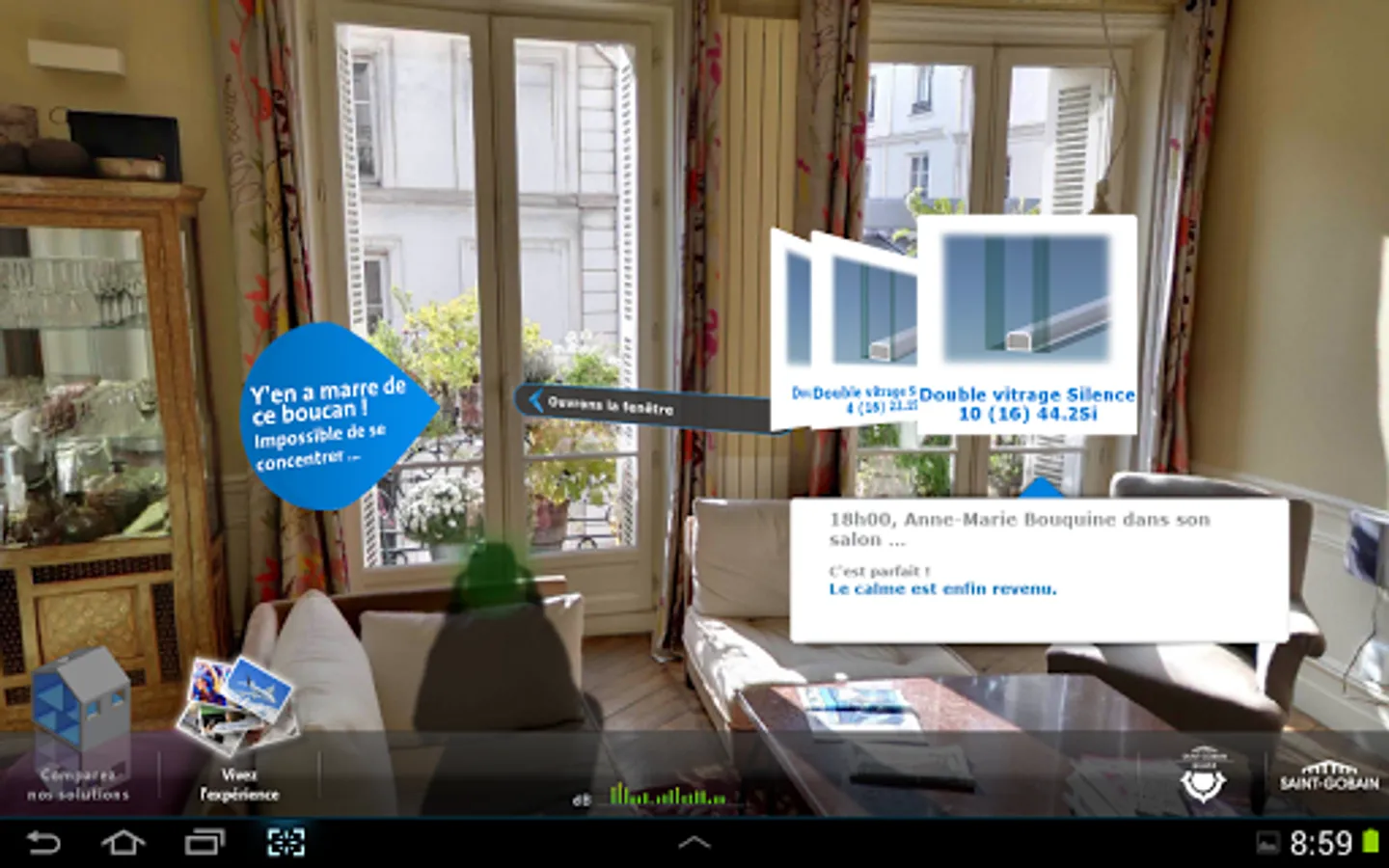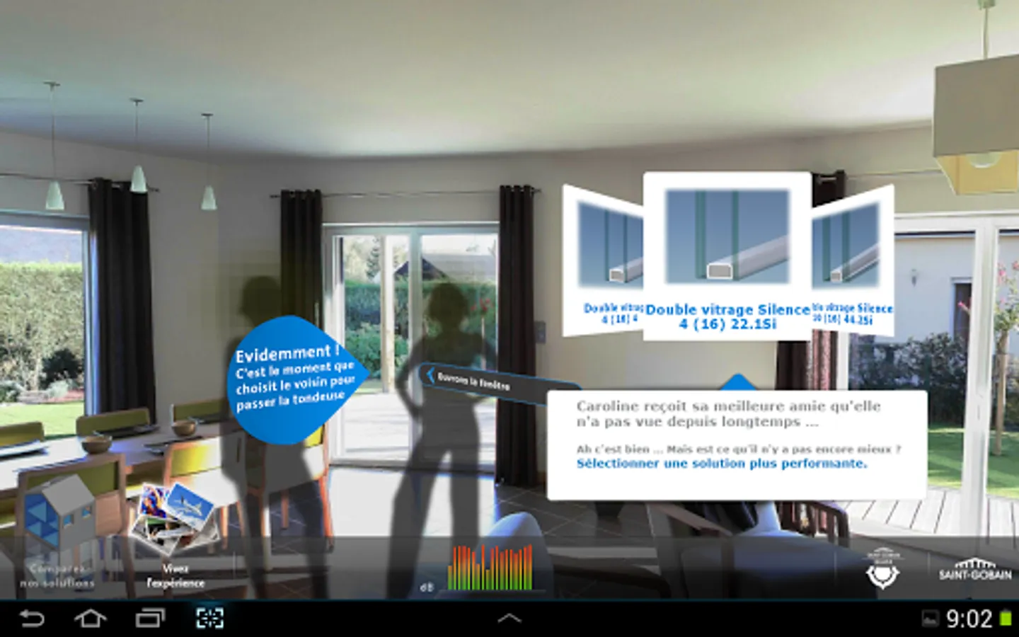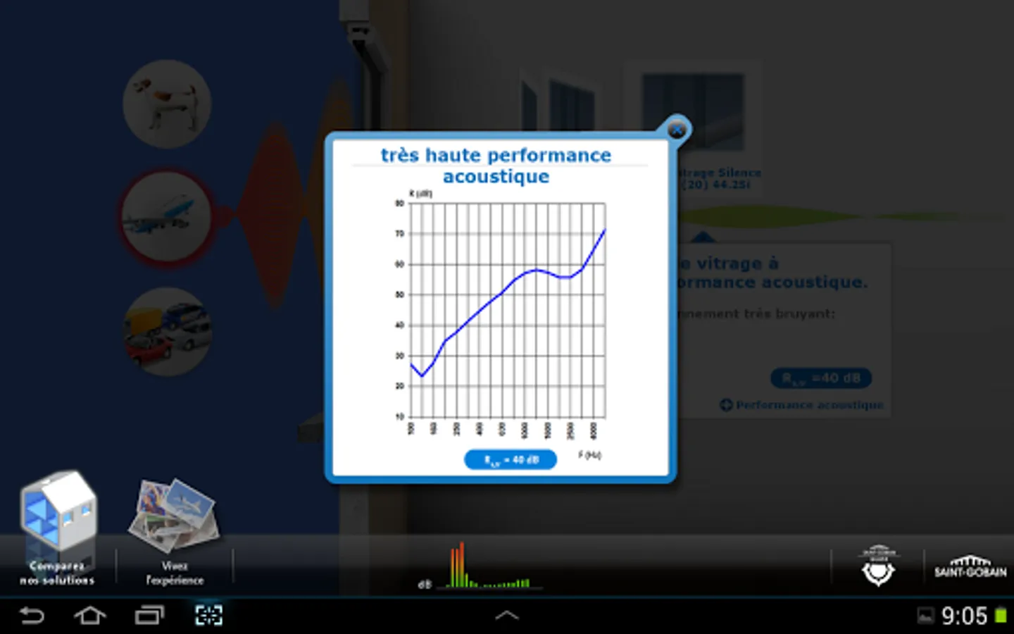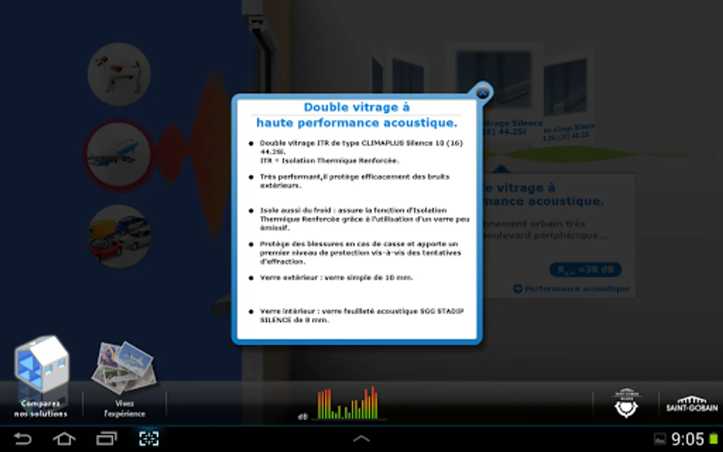 Different noisy situations commonly encountered were identified and for each of these situations, the application recreates the sound insulation provided by various insulating glazing compositions.