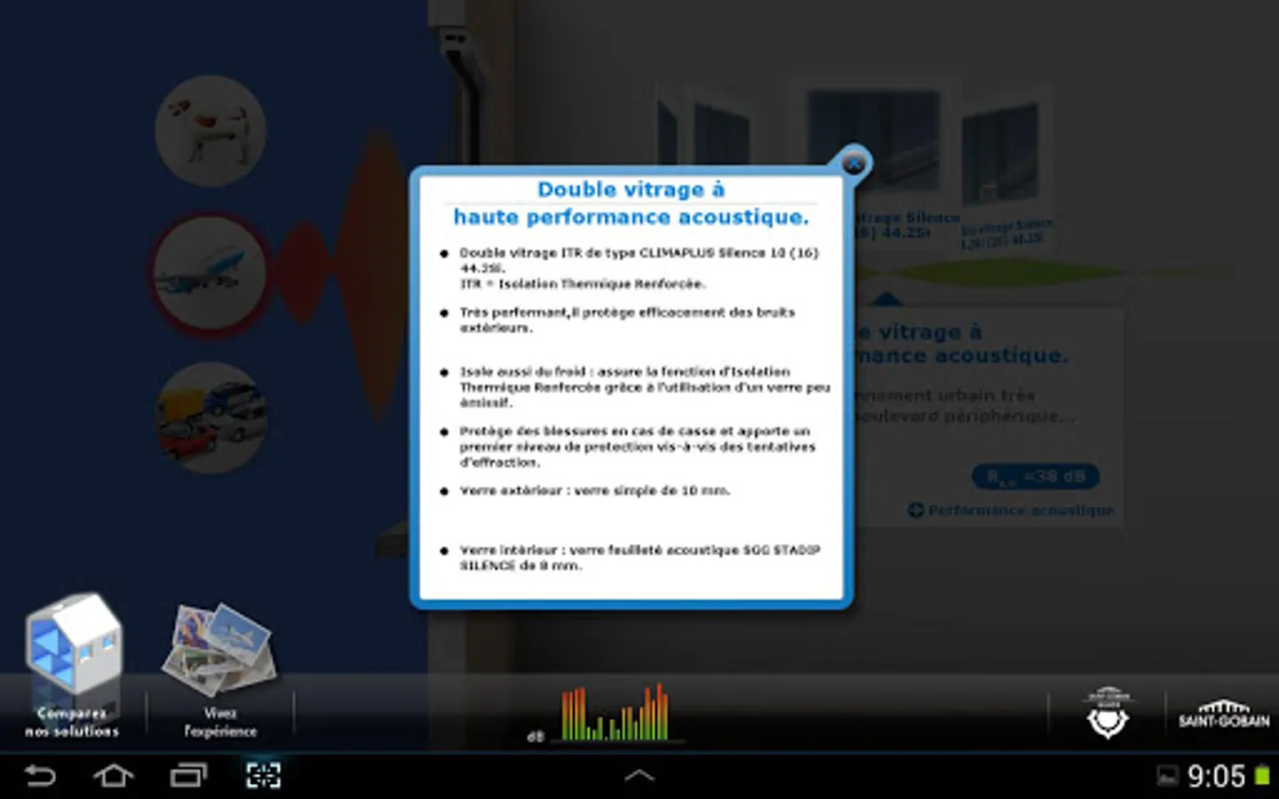 Several scenarios are considered outside noise, and for each, the application simulates the sound insulation that provides each glass composition.