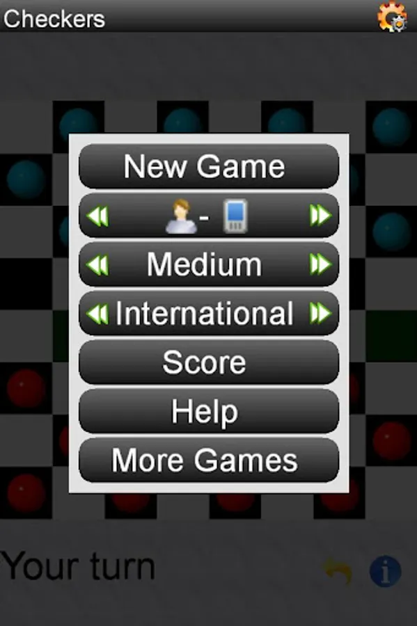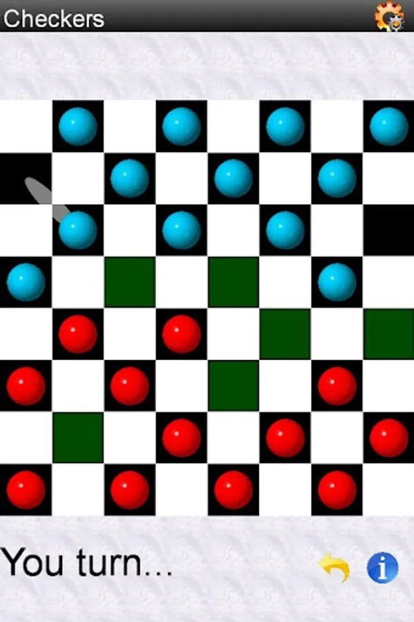 Checkers played by two opponents, on opposite sides of a board, alternating moves. In a single player mode, person is always down (blue) regardless of who is moving first. Pieces move diagonally on the dark squares and opponents' pieces are captured by jumping over them to an unoccupied square. Capturing is mandatory. When multiple capture sequence is available, player may choose the sequence but have to make all available captures. When men reach the farthest row forward, they become kings, enabling them to move backwards.