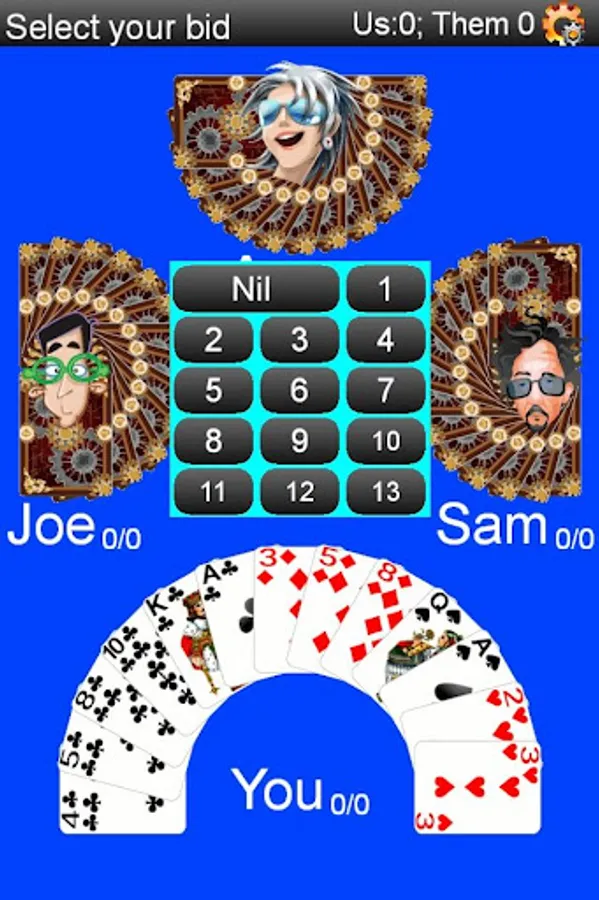 All four players bid a number of tricks. Each team adds together the bids - number of tricks that team must try to win in order to get a positive score. Everyone must bid a number. Players are not allowed to pass and bids once made cannot be altered. A bid of 0 tricks is known as Nil. This is a declaration that that the player who bid Nil will not win any tricks during the play. There is an extra bonus for this if it succeeds and a penalty if it fails. The partnership also has the objective of winning the number of tricks bid by the Nil's partner.