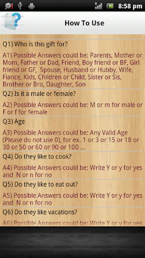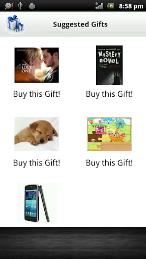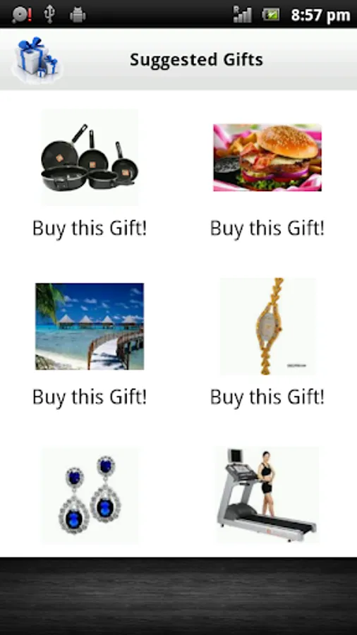 >> This app will suggest you what to buy for your Wife,Boy friend,Girl friend,Fiance,Mother,Father,Kids,Sister or even for your Brother.