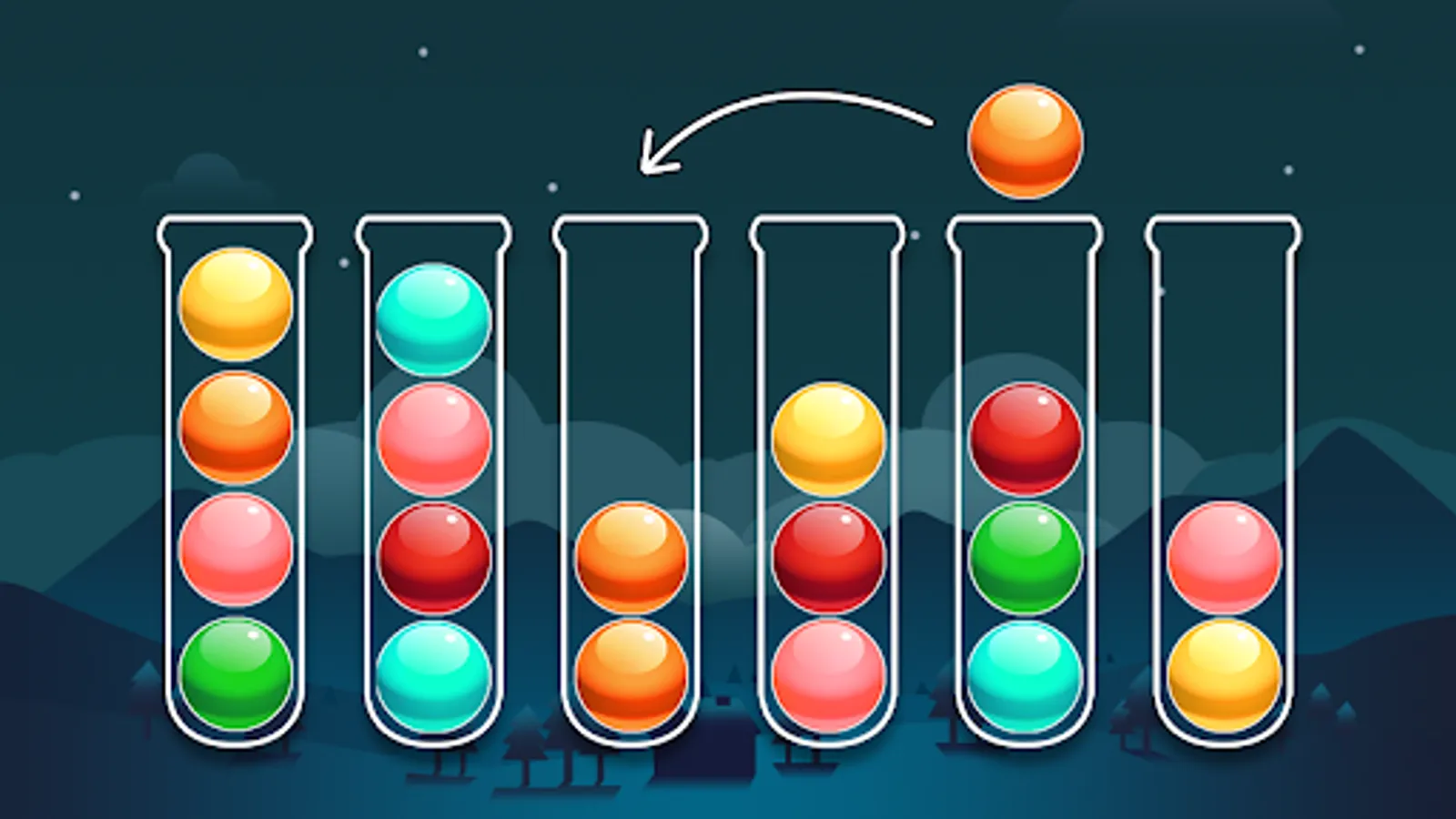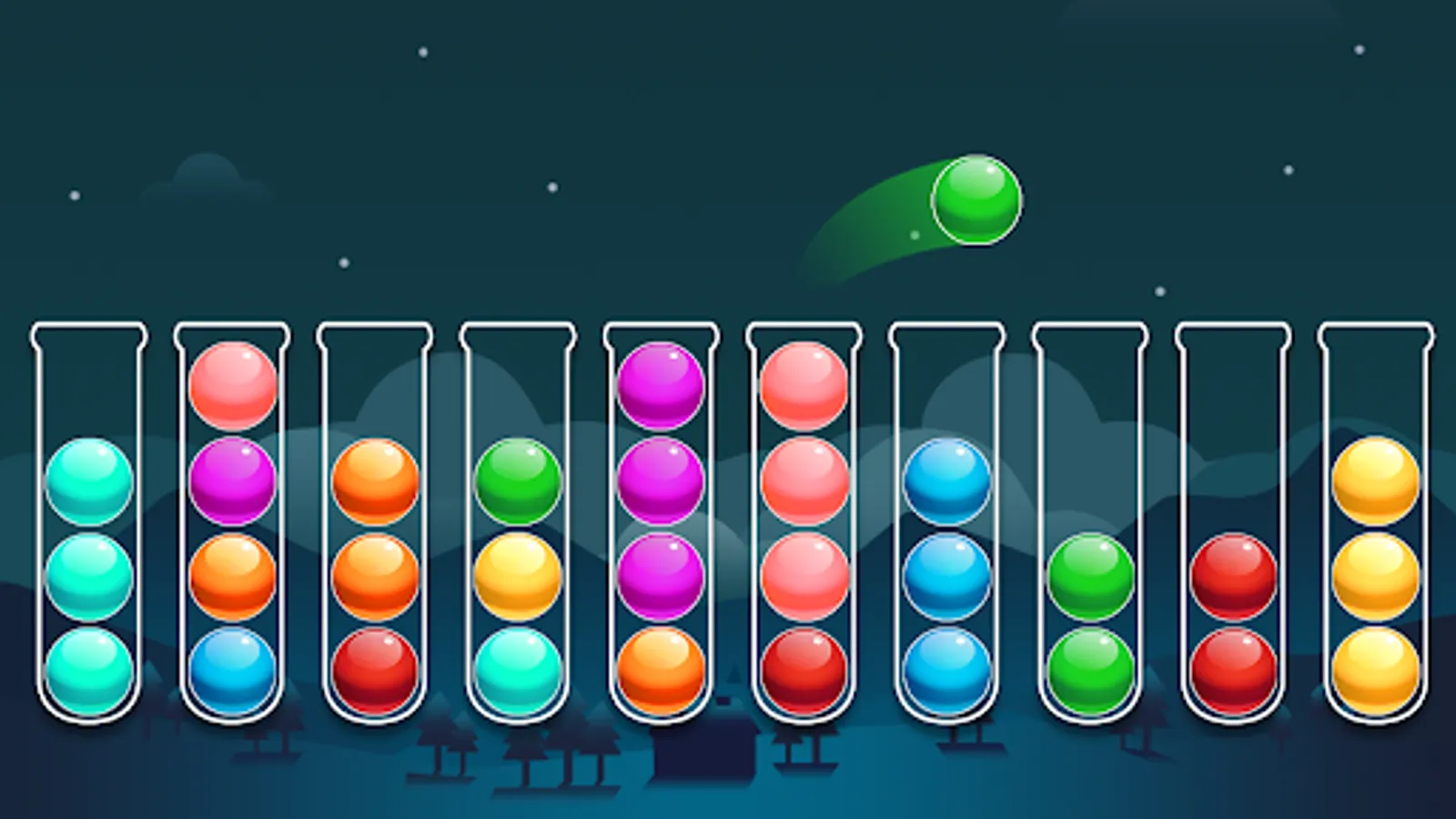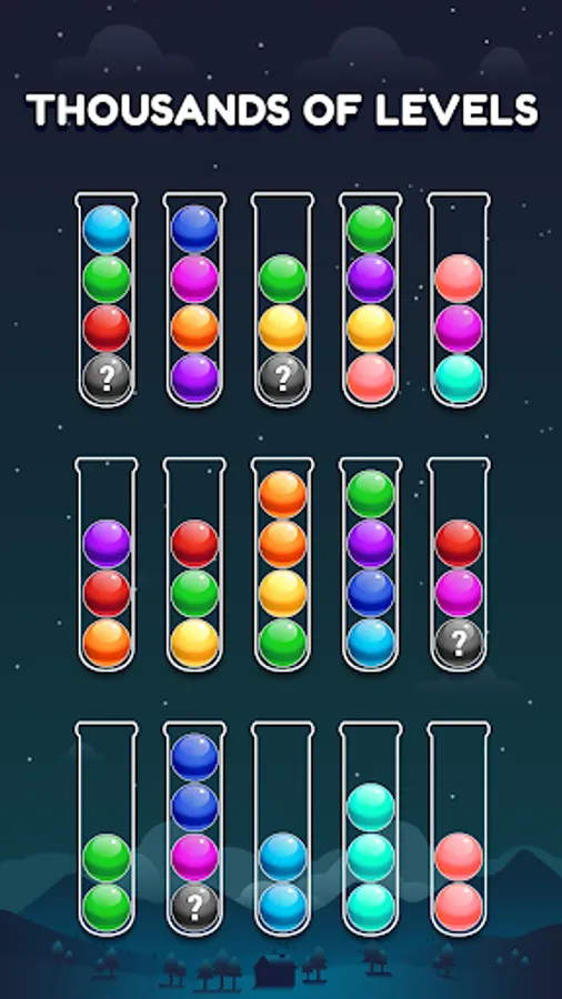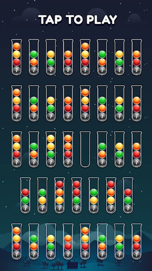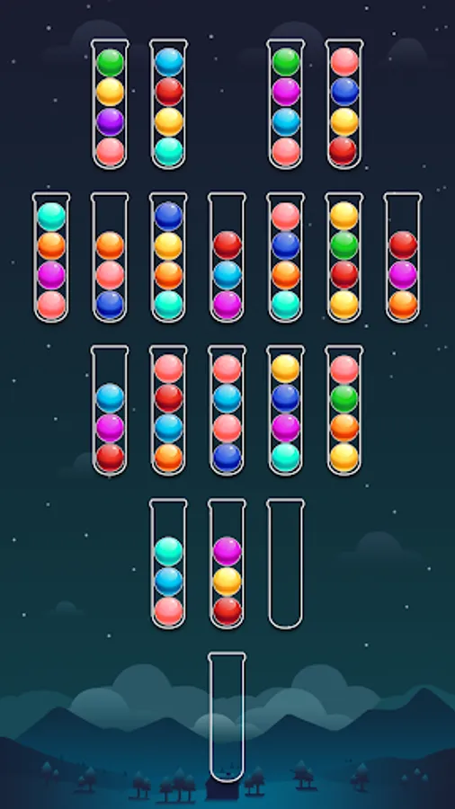 - Fill each tube with same color balls to complete level.
