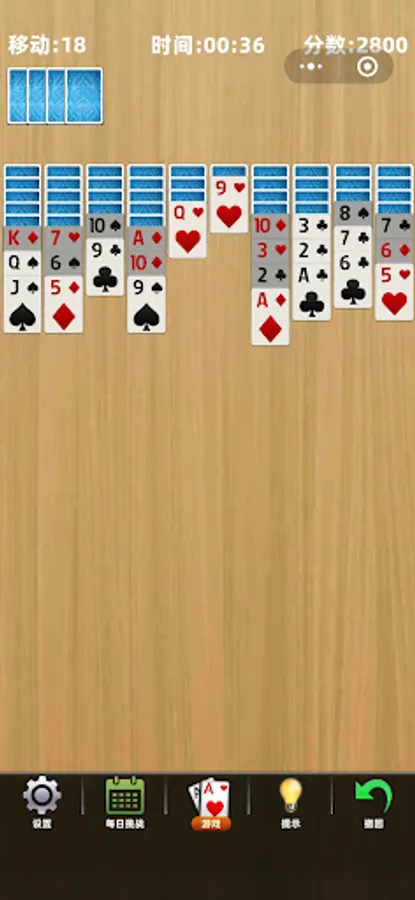 2. There is a stack of buckled cards in the upper right corner of the game, and the user can turn over these cards and use them when needed. You can turn up to 3 cards at a time, or you can choose to turn over only 1 card. Revealed cards can be exchanged for cards in other columns, or added to stacks in other columns.