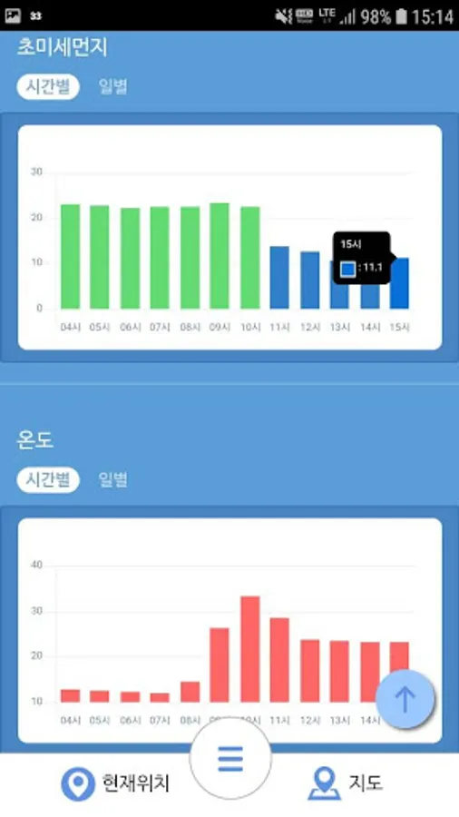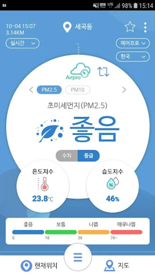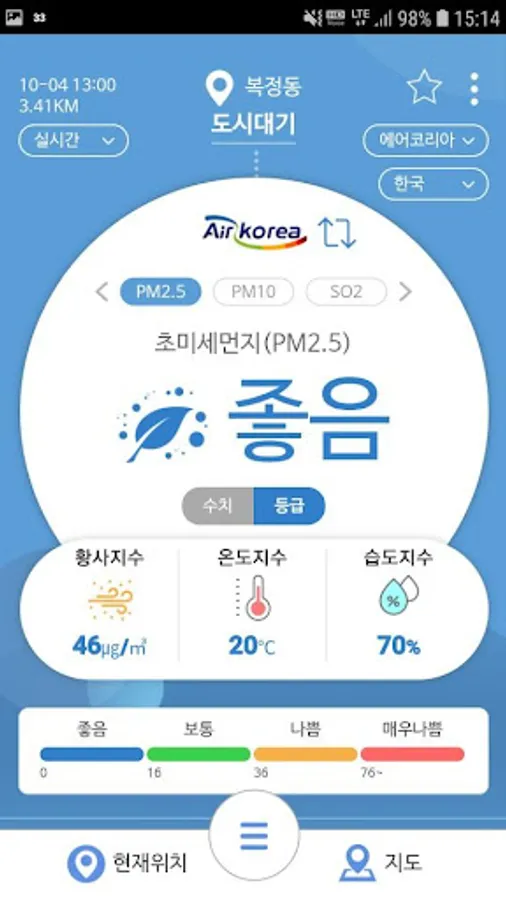 5. Real-time information displays time-wise trends in figures and graphs, and provides grade standards such as Korea and WHO to present step-by-step fine dust information and countermeasures.