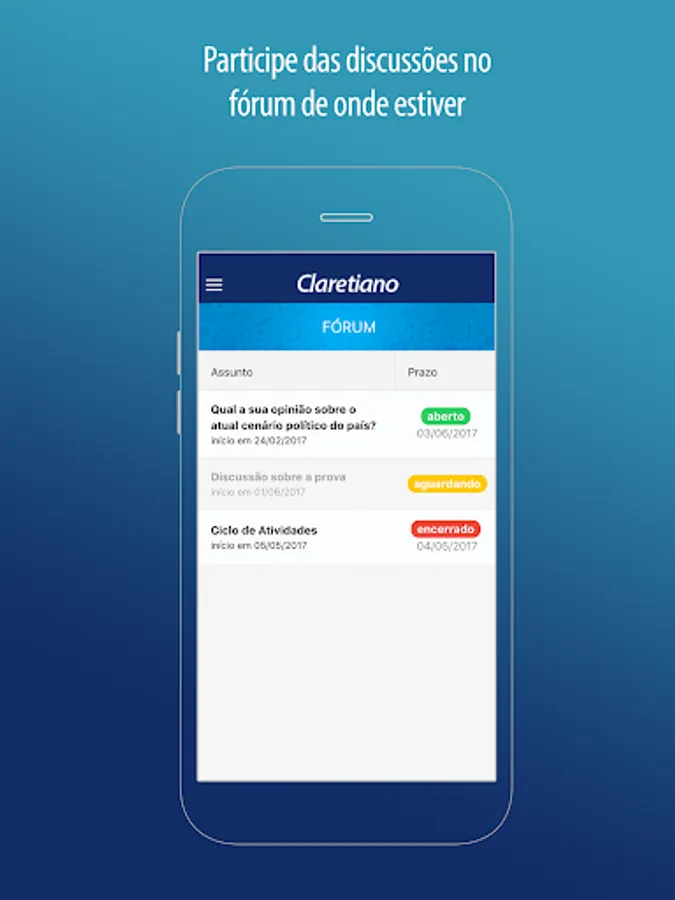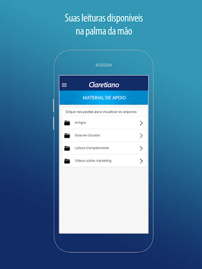 From Basic Education to Higher Education, the Claretiano - Education Network application was developed for our students to make the most of the resources of the Virtual Classroom in the palm of their hand. Among the main features of the application, we highlight: