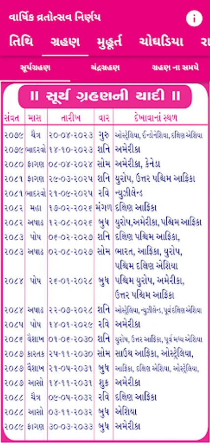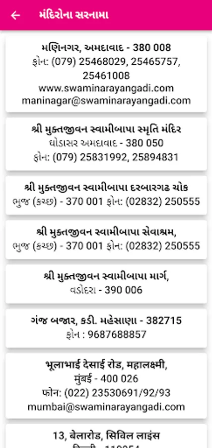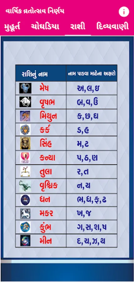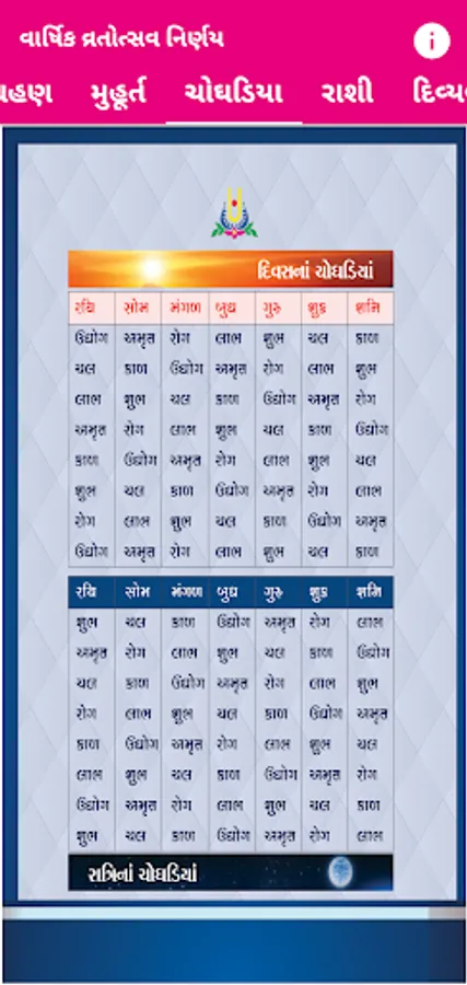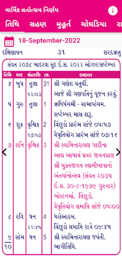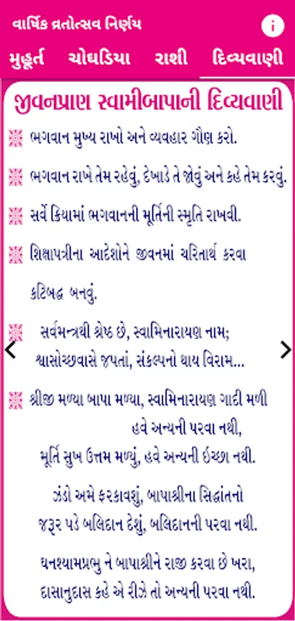 This app provides information about Tithi, Rashi, Grahan, Muhurt, Choghadiya and many more. Also It provides the addresses of all swaminarayan mandirs.