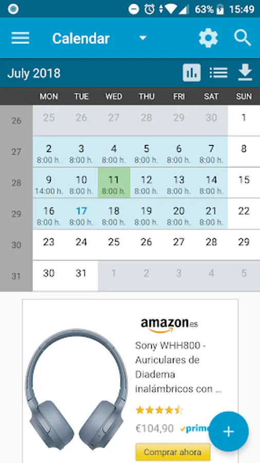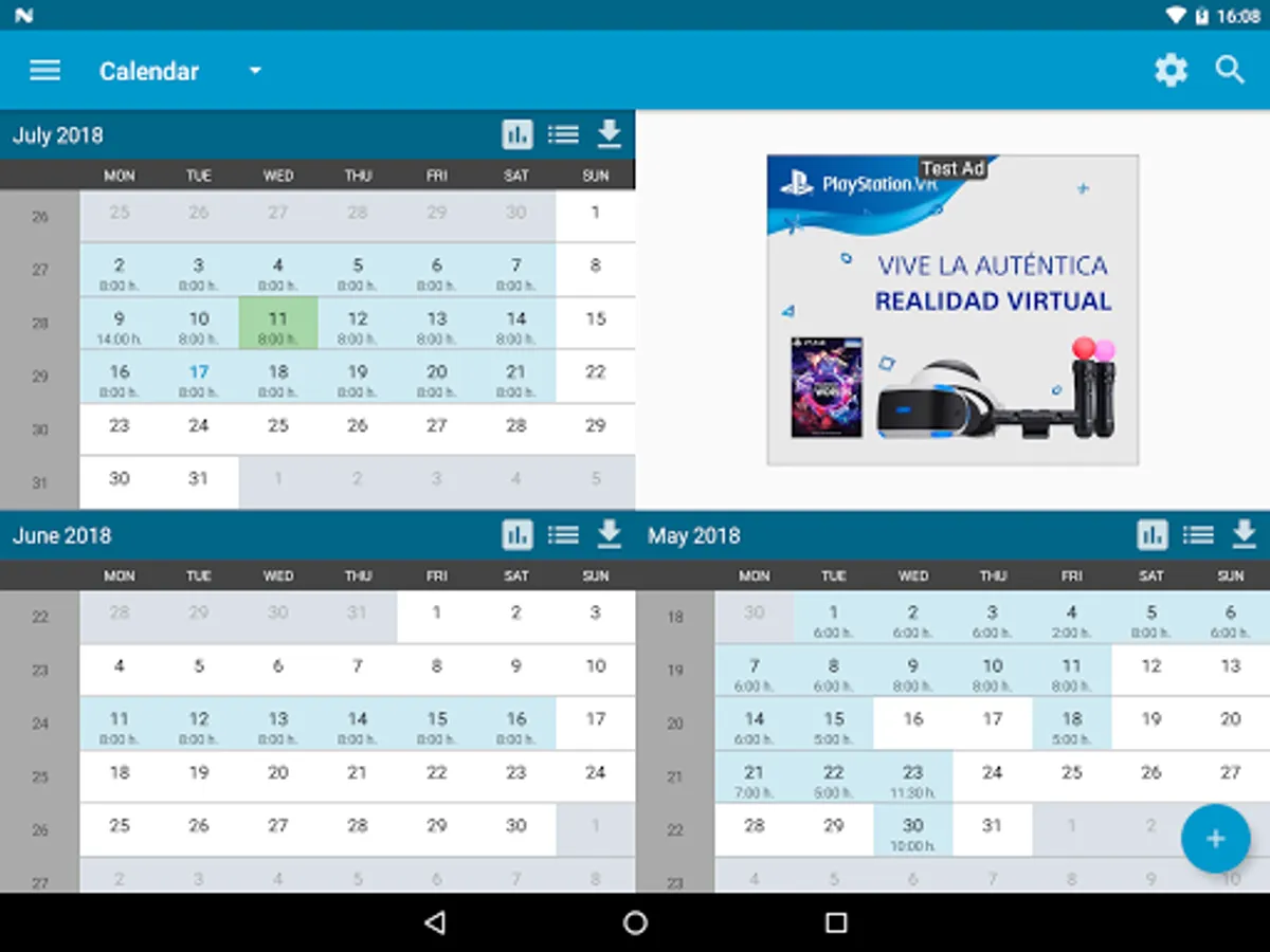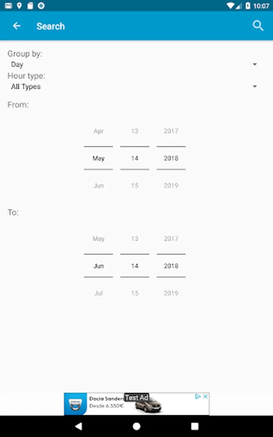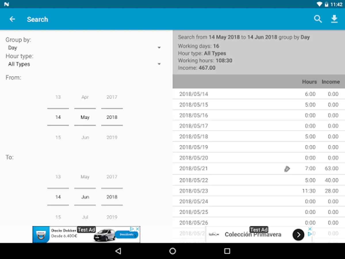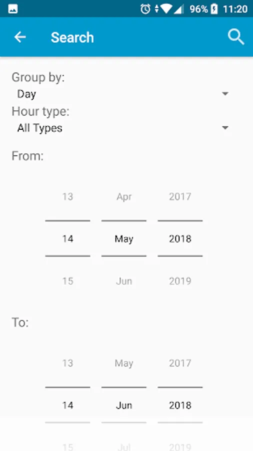 • Consult the hours spent over a period of time, being able to group them by days, weeks, fortnights, months and years, besides filtering them by hour type.