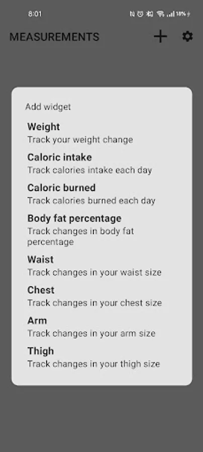 Body Measurement and Weight Loss Tracker is customizable allowing you to track any body measurement you can think of and ignore the ones you are not interested in. The following measurements are included by default: