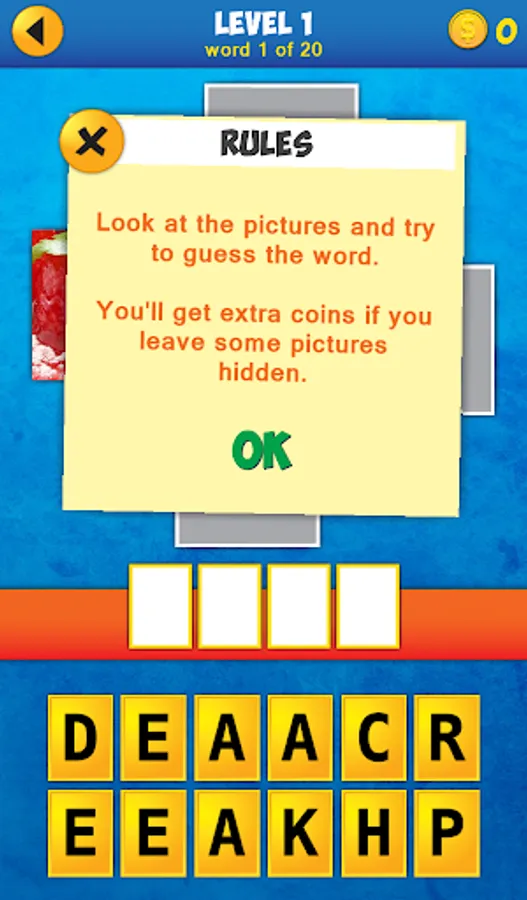 • The pictures are revealed one by one. Guess the word with less pics and earn extra coins!