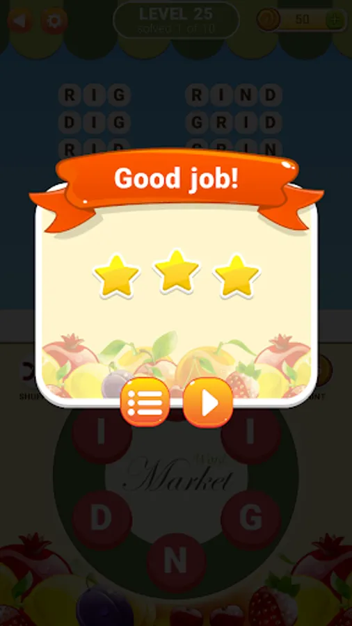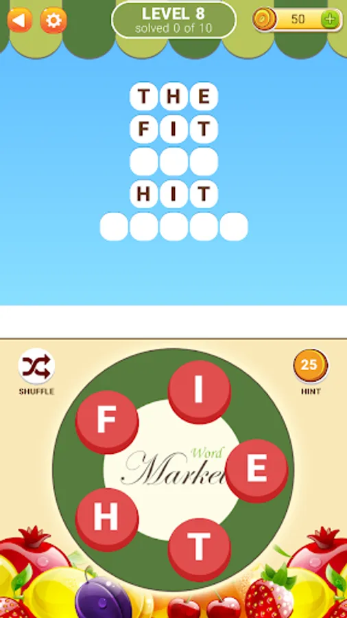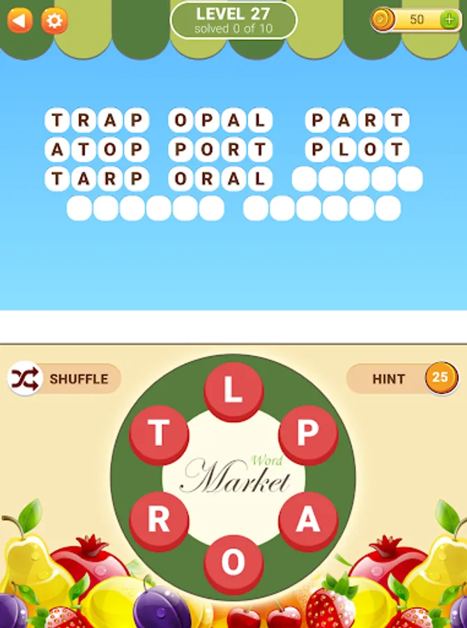 Second installment of the popular Word Market game with brand new set of puzzles. New in this game: you can now redeem hidden words for extra bonus coins. Swipe your finger over the letters on the plate to form a word and unlock a fruit. Apples, strawberries, oranges, plums... Healthy! Guess all the words, give your brain some vitamins!