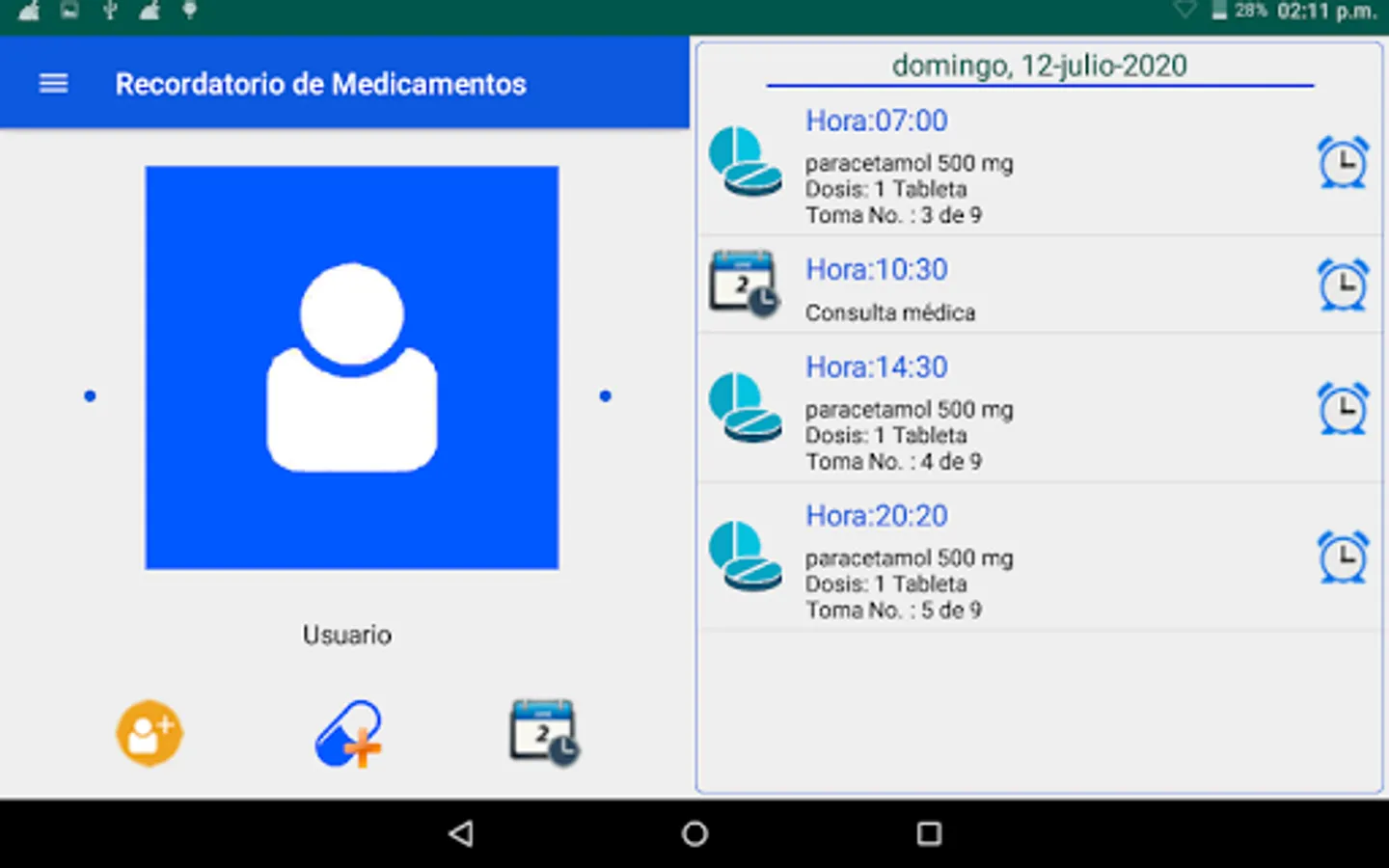Medication reminder will help you take your medications on the days and times indicated, it will also allow you to schedule medical appointments, appointments to take laboratory or cabinet studies