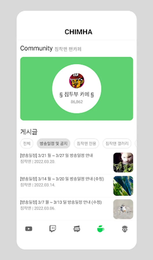 • You can easily see the posts of Chimma Man's fan cafe through categories and enjoy cafe activities.