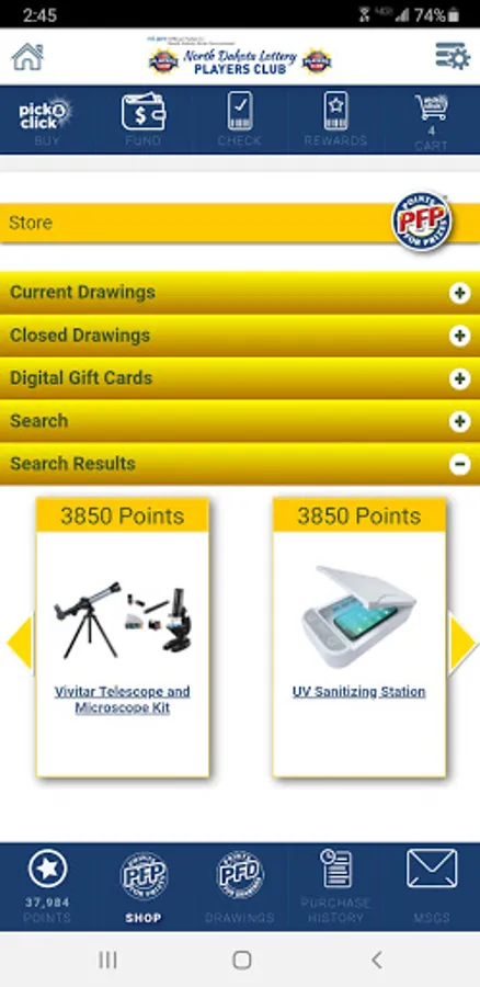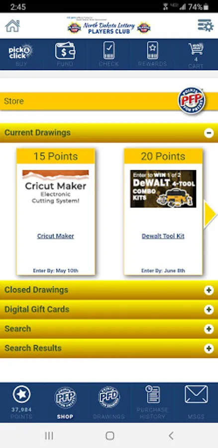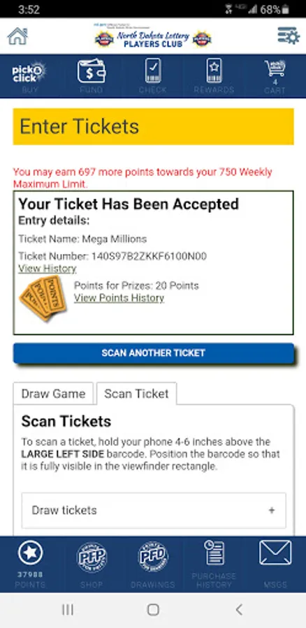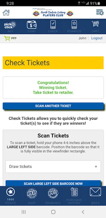 The ND Lottery Players Club mobile app makes playing the lottery even more fun, exciting and convenient with all the possibilities at your fingertips! Designed with players in mind, the ND Lottery Players Club mobile app offers ease and convenience for your on-the-go lifestyle. Buy a Pick & Click online play for as many games as you want, as often as you want! Use the CHECK feature to scan your tickets to see if you won. Also, scan your ticket with the REWARDS feature to earn points for every ticket. No need to manually enter the 25-digit webcode!