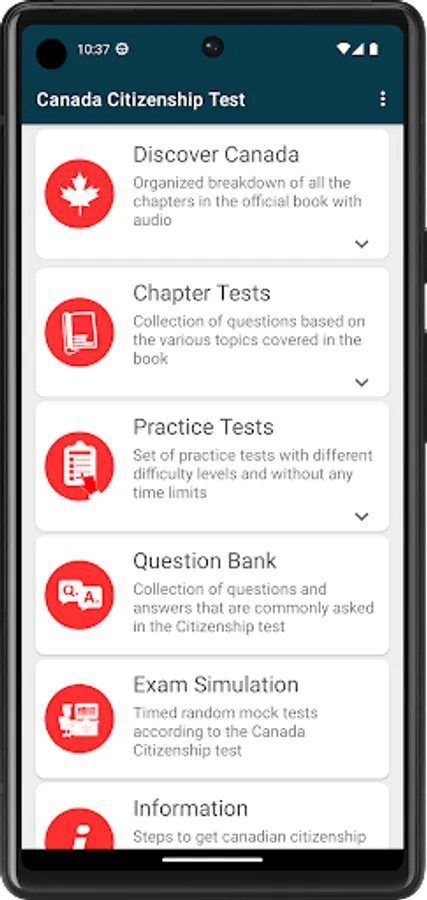 Prepare for Canadian Citizenship Test by taking practice and mock tests in a distraction-free environment. Enhance your knowledge about the rights and responsibilities of Canadians, as well as Canada’s history, geography, economy, government, laws, and symbols.