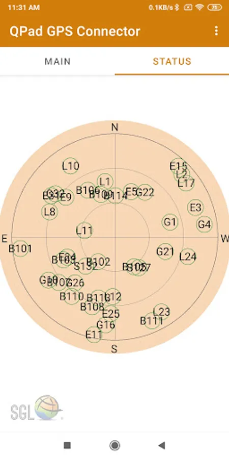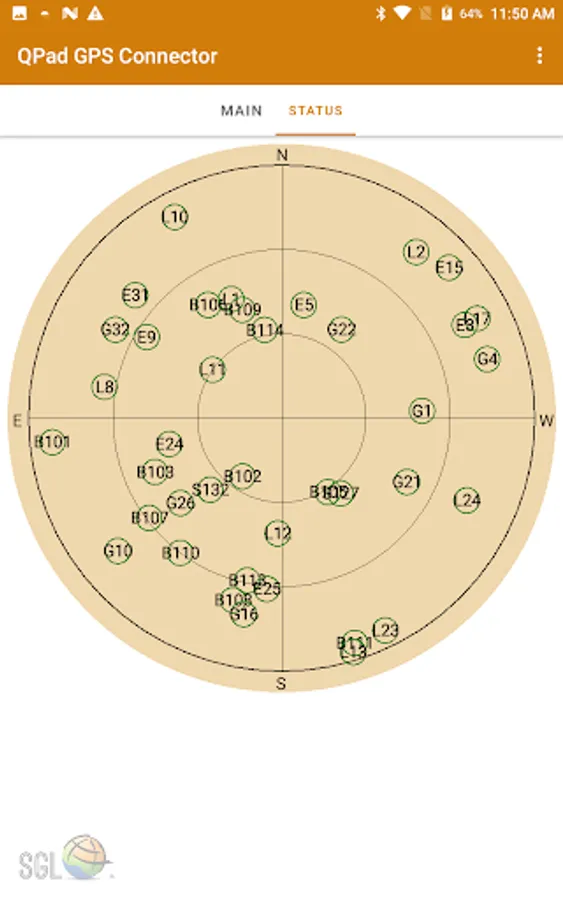 The Status screen shows satellites in use for the various supported constellations and their distribution in the sky.