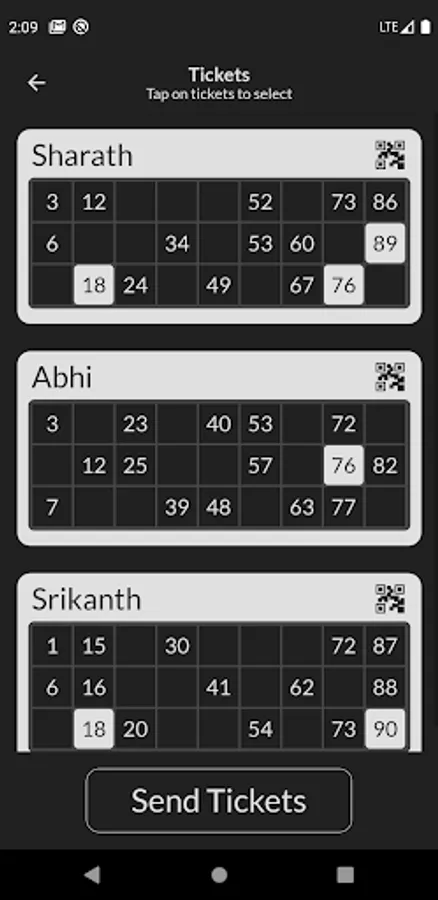 7. Tap on "Create Game" to create game with players. All tickets will be displayed upon game creation.