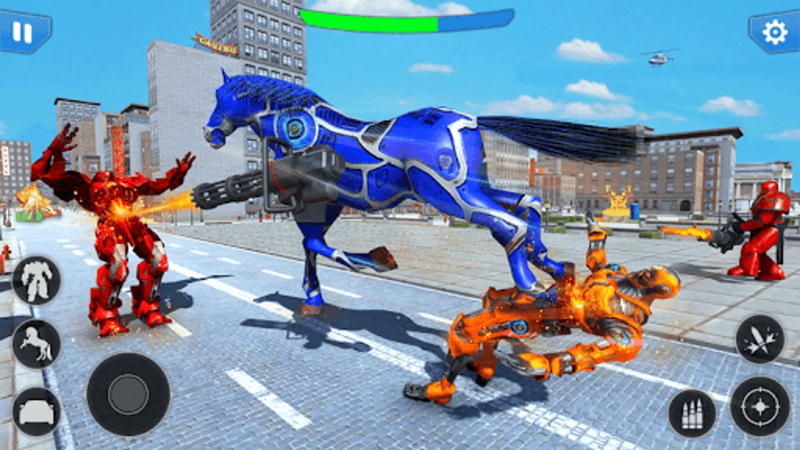 Terrorism increased due to alien robots. As they enter in city and started killing innocent people. Survive your citizens by flying horse robot transformation to reach enemy. Land near your enemy, flying car transform will take less time to reach and kill. Flying horse has unique city battle levels and mech warrior missions to make you addicted for car transforming game. This robot transform game is blend of flying car transformation. Robot fighting games will maximize the joy of horse robot games with flying car game twist in multi robot transforming games. Robot fighting game ready to give you unending fun of flying robot games.