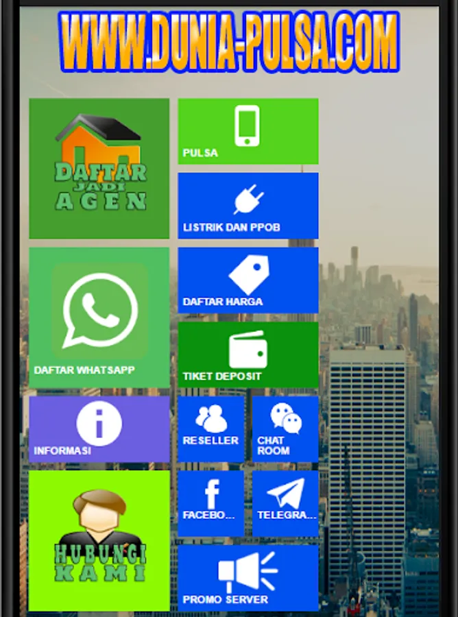 Memperkenalkan Dunia Pulsa yaitu sebuah layanan untuk melakukan isi pulsa dan pembayaran secara online. selain itu juga layanan lainnya adalah pembelian token listrik PLN, melakukan pembayaran PPOB baik itu listrik, PDAM, BPJS, Listrik Paska Bayar, Tagihan Telpon Telkom, dan lain - lain.