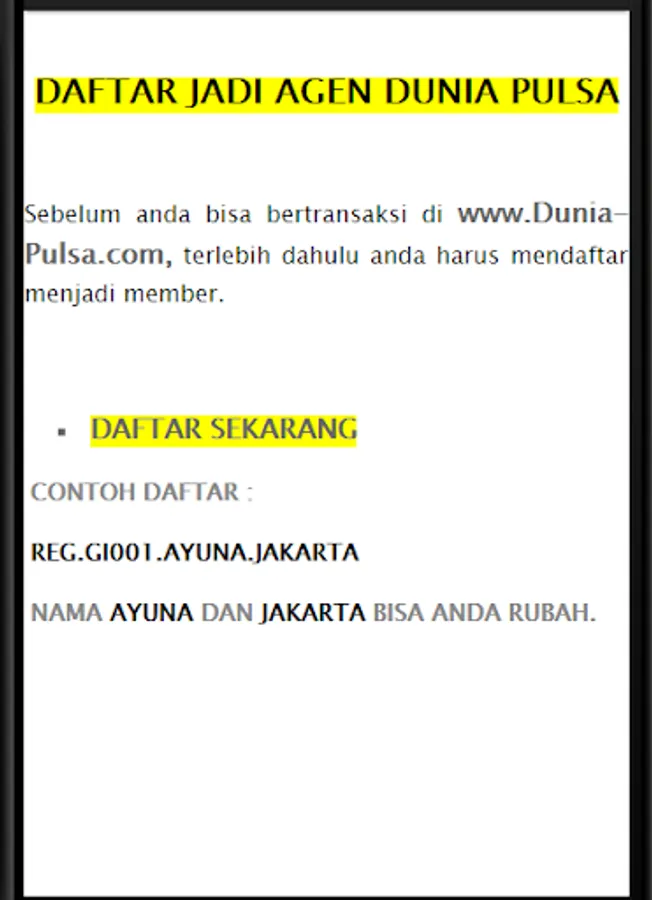 - Pendaftaran Otomatis, anda dapat langsung mencoba menjadi anggota di Dunia Pulsa dengan mudah tanpa perlu admin atau costumer service melakukan pengecekan untuk pendaftar baru. Ini membutuhkan waktu yang lama. Di sini berjalan otomatis hanya butuh beberapa detik anda sudah menjadi anggota.