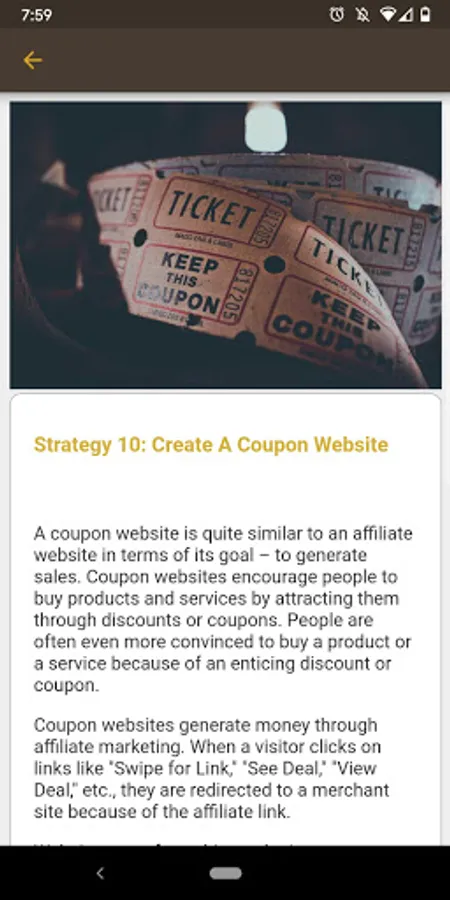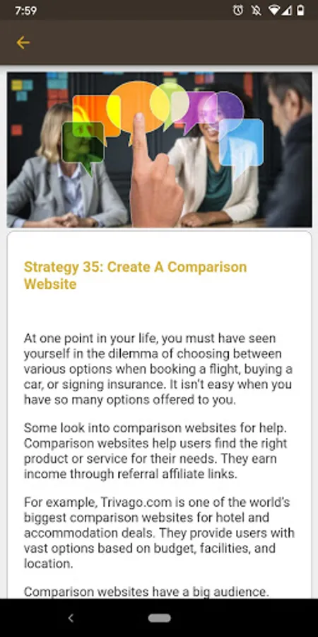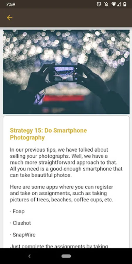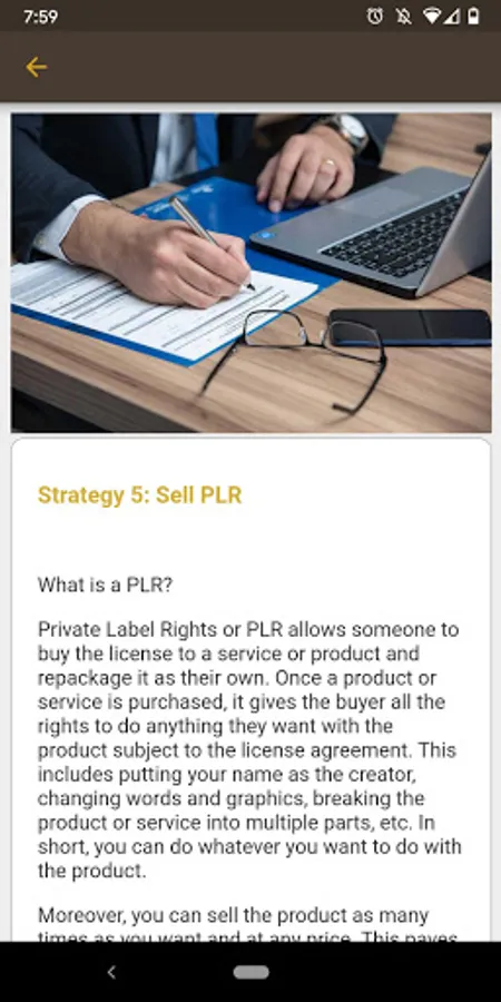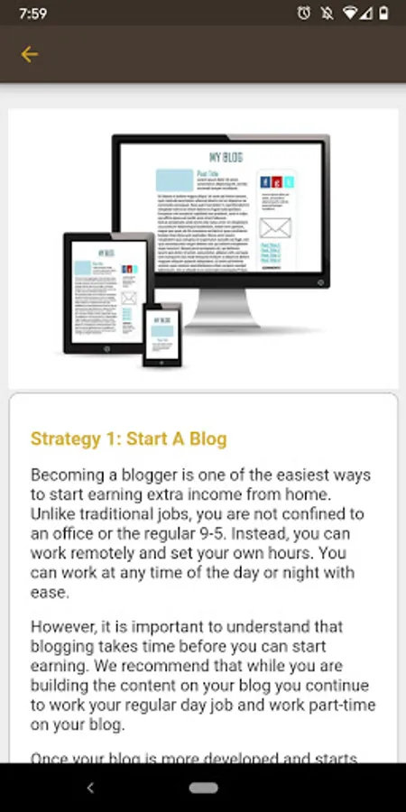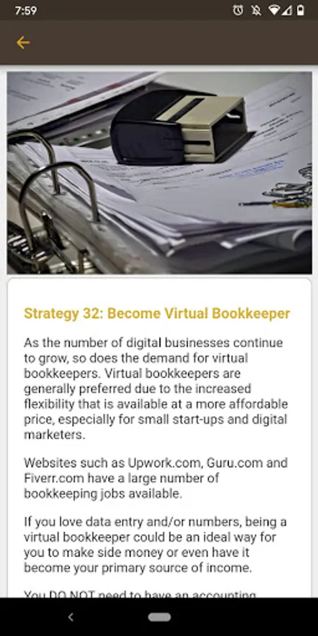 Inside this app you will find all the information you need to get started on your journey to financial freedom. Each strategy includes a through breakdown and step by step instruction on how to get started. A detailed description of every concept, what you should and shouldn’t to do make it work and tips to help you successfully start your new business to gain some extra money.