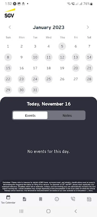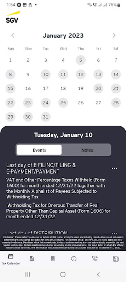 The SGV Tax Calendar app is intended to provide users with a free platform to efficiently keep track of important BIR deadlines, with a flash listing of the tax deadlines falling due on each date in the calendar and user capability to tag tax requirements according to status (e.g., done, pending, N/A) and to add offline notes on each date in the calendar.