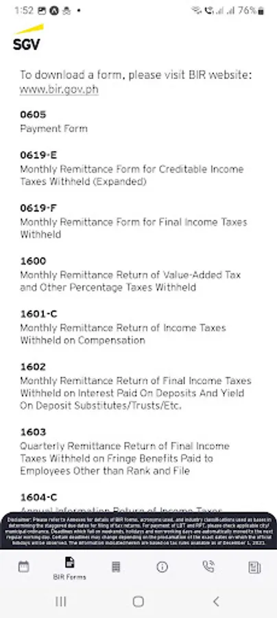 With the current global business environment, keeping track of the copious number of BIR deadlines may be a challenging endeavor. However, with this user-friendly SGV Tax Calendar app, you will be able to more easily monitor and remember BIR deadlines. Links to relevant articles and tax bulletins are also accessible to keep you up-to-date on tax rulings, issuances, circulars, opinions and decisions from Philippine government agencies, as well as judicial bodies.