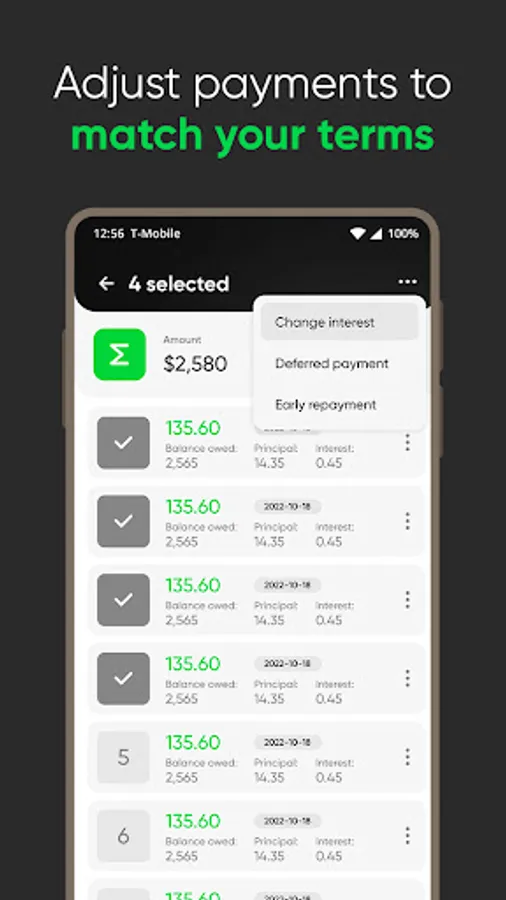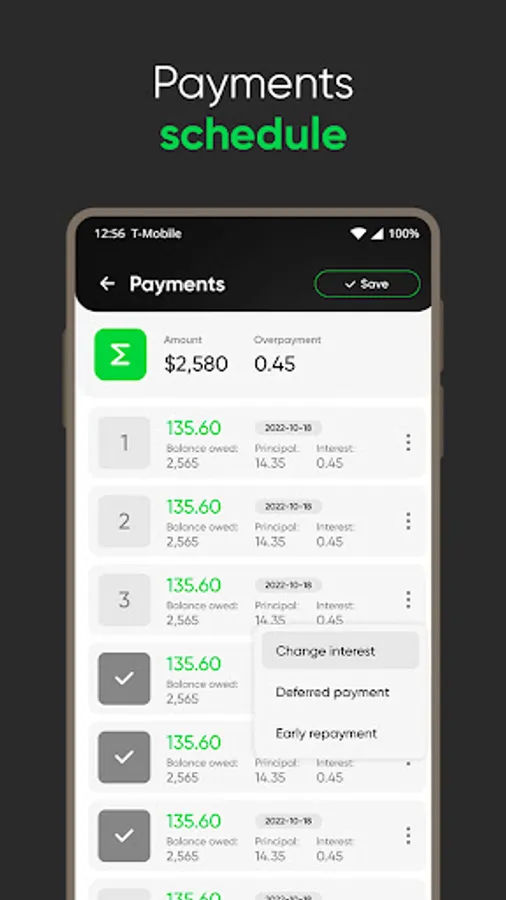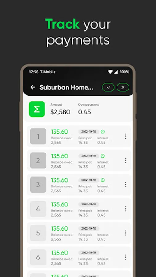 Loan Calculator is a straightforward. It's easy to keep track of your payments on your phone. The whole process takes less than a minute. You get a printed installment schedule from the bank, enter your details and press the "calculate" button. For the calculation you will need the following: date of first payment, loan sum, loan payment term and the bank's interest rate. That's all the info you need for a convenient and precise installment schedule. Save the results and take a look whenever you need to! No need for the printed version anymore. All your loan info is on your phone.