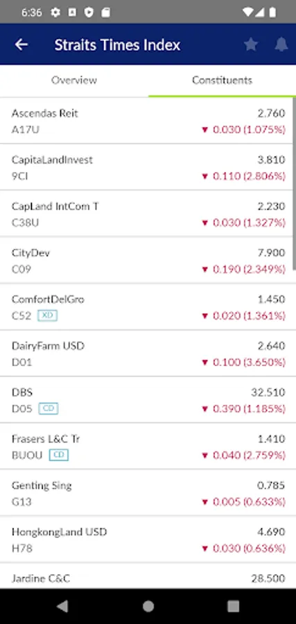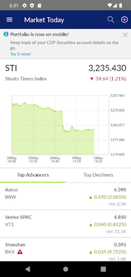Overall Market - Get a feel of the Market sentiment based on the STI index, along with the top 5 Advancers & Decliners