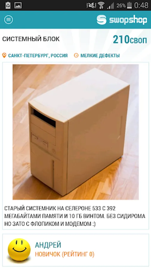 SwopShop - a system designed for the exchange of non-monetary items. To facilitate the search for the exchange of lots, put in the local currency (SWAP). You give your old stuff to other users, and in return receive swaps, which in turn can purchase any items featured in the catalog.