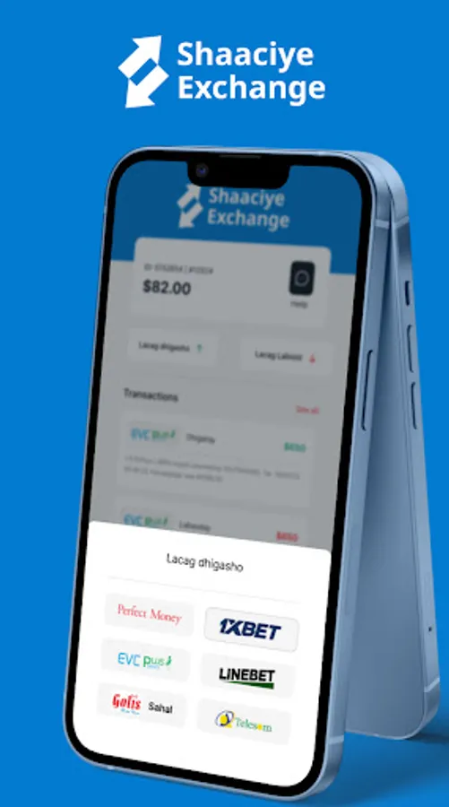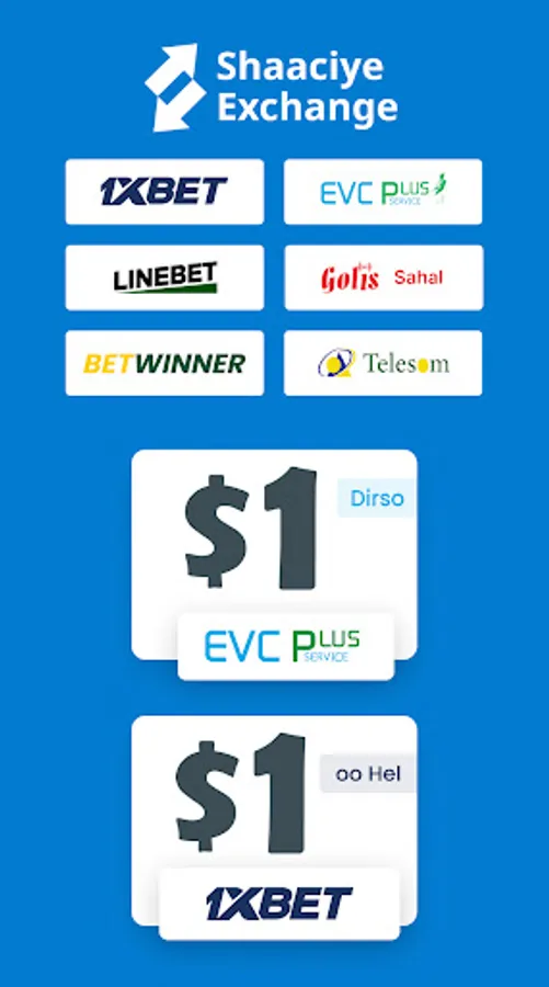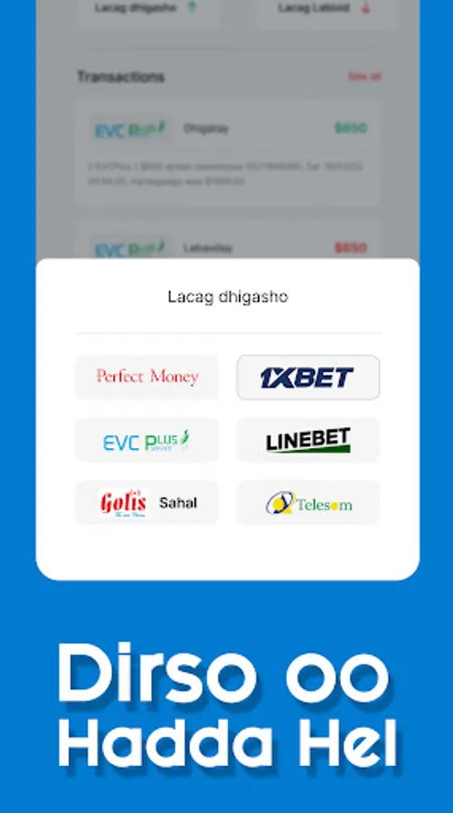 EvcPlus, Jeeb, E-Dahab, E-Sahal, Golis, 1Xbet, Linbet, Betwinner iyo Perfect Money