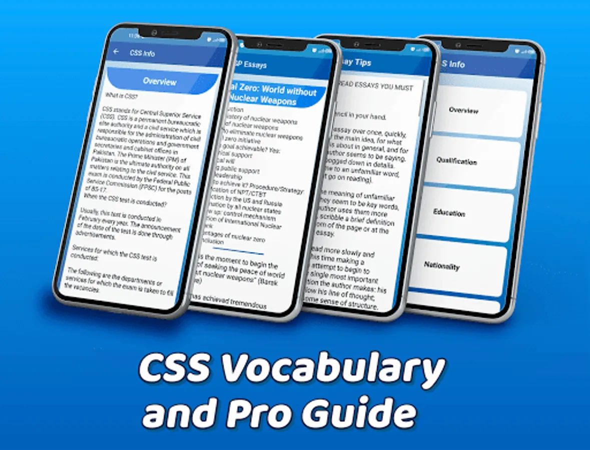 This app is helpful in each competitive exam such as GRE, IELTS, TOEFL, GAT, NTS, PMS, GMAT, GTEC, PPSC Exam, ICS (Indian Civil Service), IAS (Indian Administrative Service), IPS (Indian Police Service), UPSC