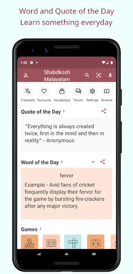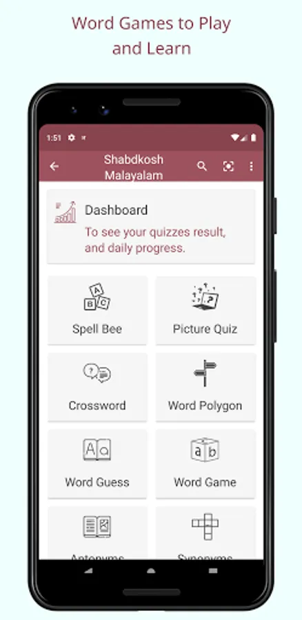 The nifty Word Quiz Game Quiz in English and Malayalam helps you pass time while learning something new! The users of Shabdkosh English Malayalam Offline Dictionary App are very fond of this simple and quick games - which also works without using your data in offline mode.